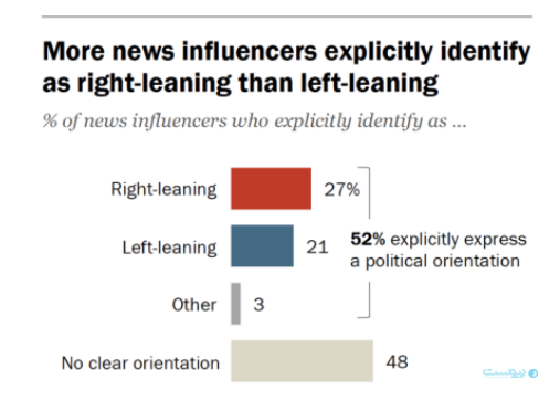 حدود نیمی از اینفلوئنسرها هیچ گرایش سیاسی مشخصی را بیان نمیکنند. اینفلوئنسرهای فیسبوک به طور خاص بیشتر احتمال دارد که دیدگاههای راستگرایانه را به طور برجسته بیان کنند؛ در این سایت، سه برابر بیشتر اینفلوئنسر خبری محافظهکار صریح (۳۹ درصد) نسبت به اینفلوئنسرهای لیبرال (۱۳ درصد) وجود دارد.