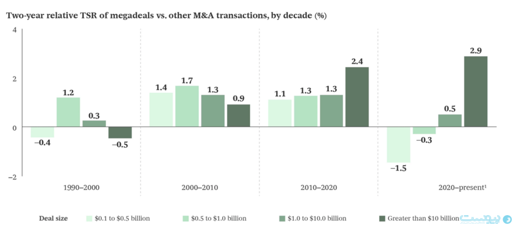 با وجود سختگیریهای نظارتی، مدیران عامل در مواجهه با چالشهای فرهنگی، عملیاتی و مالی ناشی از ادغامهای بزرگ، هر روز ماهرتر میشوند و بهتر میتوانند از این معاملات ارزش استخراج کنند. دادهها نشان میدهد معاملات کلانی که در این دهه انجام شدهاند، توانستهاند بازده نسبی سهامداران (TSR) طی دو سال پس از معامله را به طور قابل توجهی افزایش دهند.