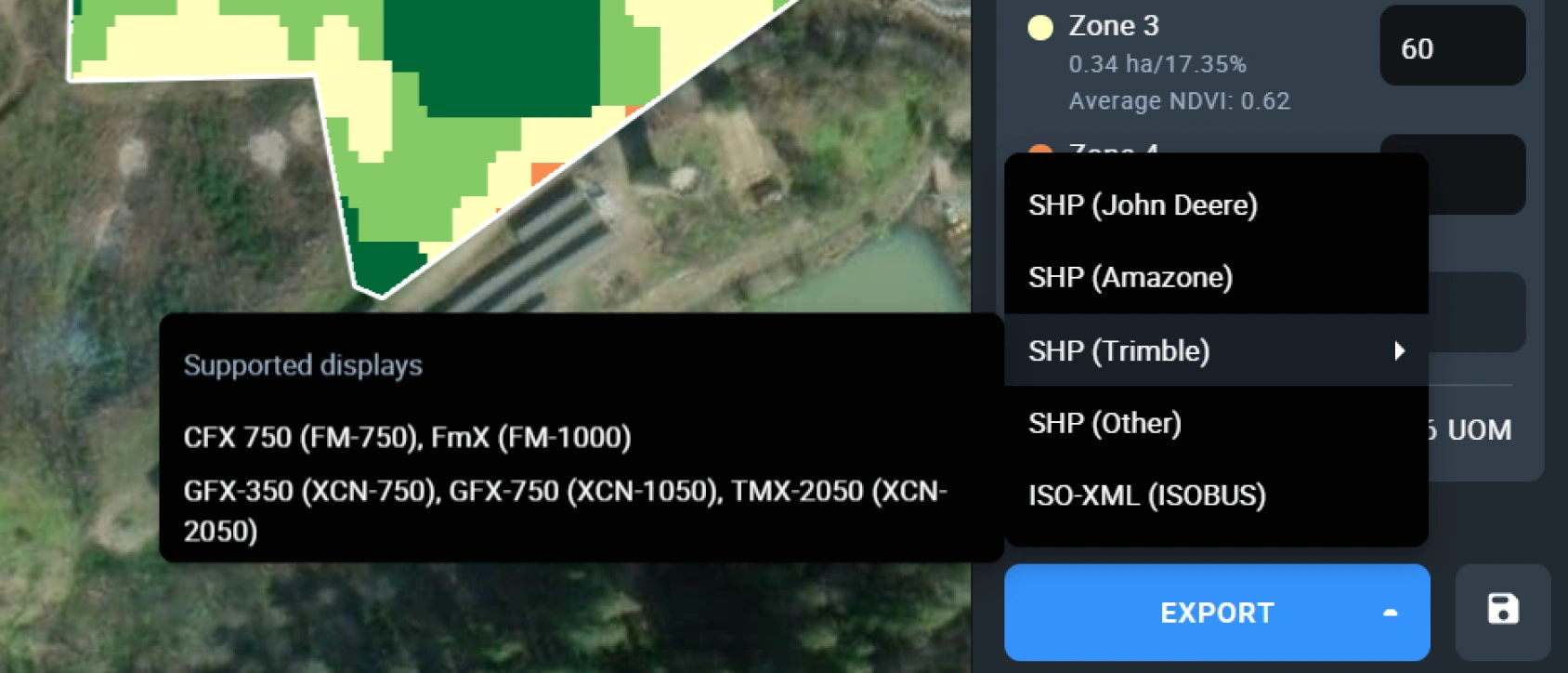 وقتی آماده اجرای طرح VRT شدید، سامانه EOSDA Crop Monitoring با ماشینآلات کشاورزی شما یکپارچه میشود. میتوانید اسکریپتهای سفارشی بذرپاشی را در فرمتهای ISO-XML یا SHP استخراج کرده و با برندهای معروفی مانند Trimble، Amazone و John Deere استفاده کنید.