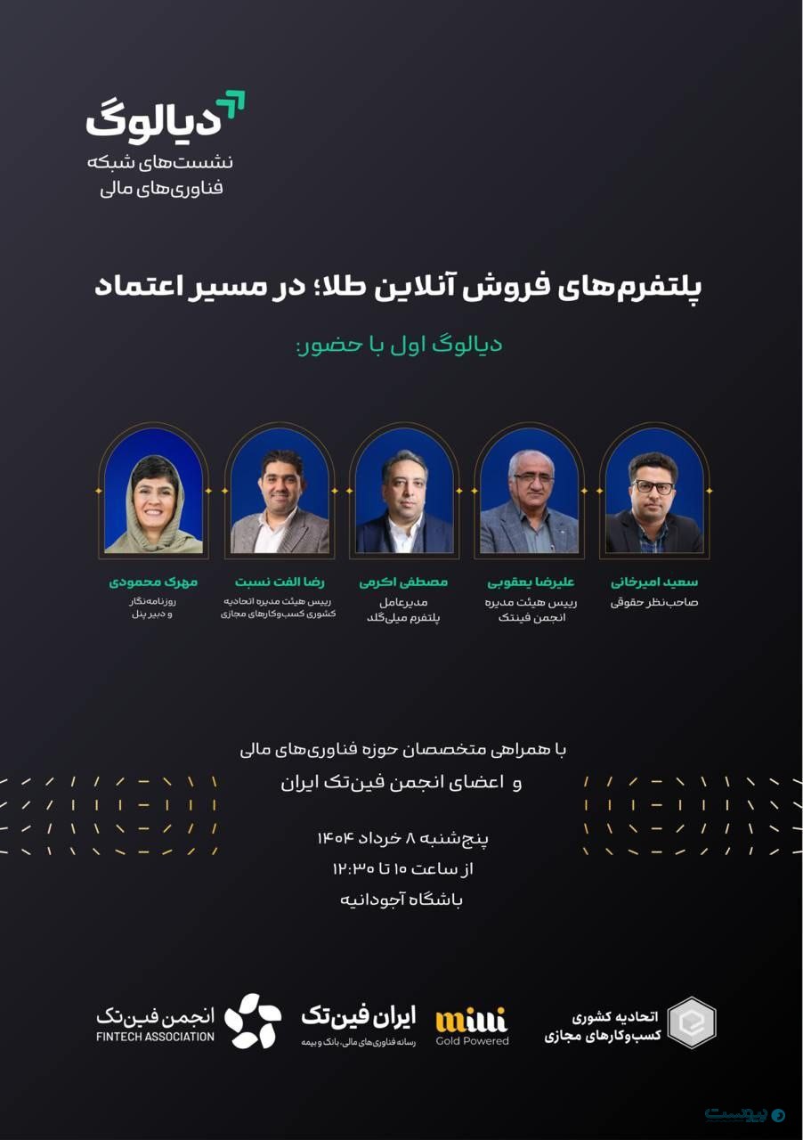 نخستین نشست تخصصی از مجموعه نشستهای «دیالوگ» با محوریت «پلتفرمهای فروش آنلاین طلا؛ در مسیر اعتماد»، روز پنجشنبه ۸ خردادماه ۱۴۰۴ برگزار خواهد شد.این رویداد با هدف بررسی ابعاد مختلف اعتمادسازی در اکوسیستم نوظهور فروش آنلاین طلا و با حضور فعالان برجسته حوزههای فینتک، مدیران پلتفرمهای فروش آنلاین، سیاستگذاران و پژوهشگران برگزار میشود.