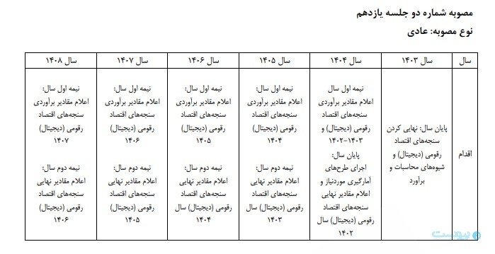 در جزئیات این موضوع و بخشی از وظایف شورا نیز آمده است: تصویب سنجههای اقتصاد رقومی (دیجیتال) مبتنی بر آخرین الگوها و استانداردهای ارائه شده از سوی نهادهای بین المللی مرجع و مبتنی بر رویکرد پایین به بالا ظرف سه ماه از زمان ابلاغ نظامنامه و به روزرسانی آنها در صورت لزوم در بازههای معین، تصویب شیوه و زمان اجرای طرح های آمارگیری برای محاسبه سنجه های اقتصاد رقومی (دیجیتال در سطوح جغرافیایی ظرف سه ماه از زمان ابلاغ نظام نامه و به روزرسانی آنها در صورت لزوم در بازههای معین تصویب فرآیند به روزرسانی و انتشار محاسبات و برآوردهای سنجه ها شامل بازنگری در سنجهها مبتنی بر رویکردهای آینده نگر و مطابق جدول زیر که در صورت ضرورت و با تصویب شورا تغییر خواهد کرد.
