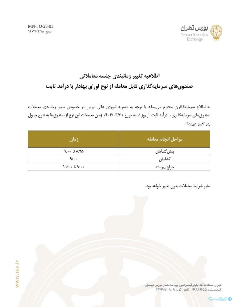 مدیر نظارت بر بورسهای سازمان بورس از شروع به کار معاملات صندوقهای سرمایهگذاری با درآمد ثابت از شنبه ۳۱ خرداد ۱۴۰۴ خبر داد.