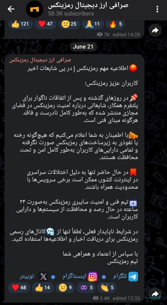 در این اطلاعیه گفته شده: هیچگونه رخنه یا نفوذی به زیرساختهای رمزینکس صورت نگرفته و تمامی داراییهای کاربران بهطور کامل امن و تحت محافظت هستند.