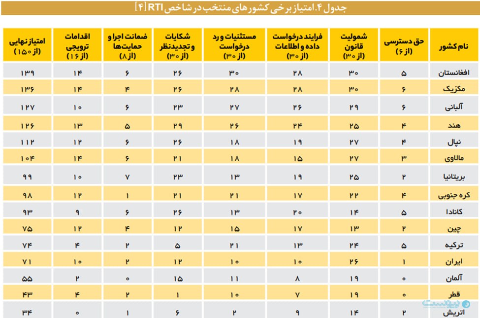 ایران با کسب امتیاز ۷۱ از ۱۵۰، در رتبه ۱۰۴ میان ۱۴۰ کشور جهان در باره شاخص جهانی حق دسترسی به اطلاعات قرار گرفته است. این شاخص که مهمترین مرجع بینالمللی در سنجش کیفیت قوانین دسترسی آزاد به اطلاعات محسوب میشود، وضعیت کشورها را صرفاً بر پایه قوت قوانین آنها ارزیابی میکند. مرکز پژوهشهای مجلس درگزارشی با بررسی رتبهبندی شاخص جهانی حق دسترسی به اطلاعات (RTI) اعلام کرده است بخش قابلتوجهی از امتیازات ایران به دلیل برداشتهای ناقص ارزیابان بینالمللی از مفاد قانون «انتشار و دسترسی آزاد به اطلاعات» لحاظ نشده است. به گفته پژوهشگران، در صورت تبیین دقیقتر مقررات موجود برای ارزیابان، بدون نیاز به اصلاح قانون، امکان کسب ۳۶ امتیاز دیگر و ارتقای رتبه ایران تا جایگاه ۳۱ وجود دارد.