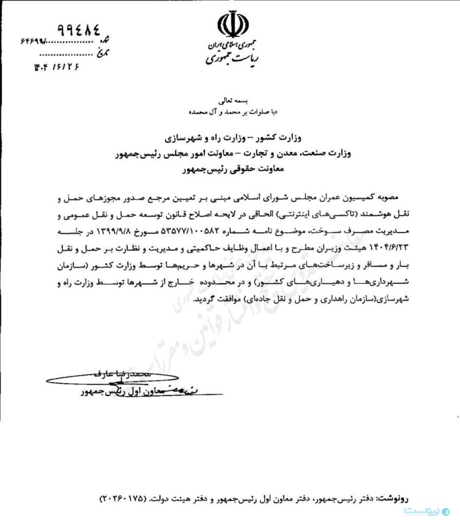 محمد رضا عارف با ارسال نامه به کمیسیون عمران مجلس بر نظارت وزارت کشور و سازمان شهرداریها بر تاکسیهای اینترنتی تاکید کرده است. در اصل معاون اول ریاست جمهوری با این نامه بر مصوبههای پیشین دولت صحه گذاشته است در تمامی مصوبههایی که تا کنون در خصوص تاکسیهای اینترنتی صادر شده است نظارت بر عهده وزارت کشور و صدور مجوز بر عهده اتحادیه است.
