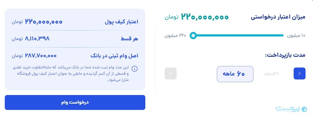 قابلیت انتخاب مبلغ وام نیز از ۱۰ تا ۲۲۰ میلیون تومان وجود دارد. بهطور طبیعی هر چه مبلغ وام بالاتر باشد، مدت بازپرداخت نیز طولانیتر خواهد شد. بهاینترتیب هر کاربر میتواند با درنظرگرفتن شرایط شخصی، بهترین ترکیب را برای خرید اقساطی خود پیدا کند.