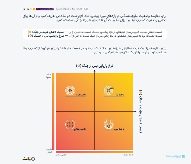 برای مقایسه وضعیت تبلیغ دهندگان در بازههای مورد بررسی، یکتانت با تعریف دو شاخص برای تحلیل وضعیت کسب وکارها و میزان مقاومت آن ها در برابر شرایط جنگی استفاده کرده است. بررسی مجموع بودجه کمپینهای تبلیغاتی چهار گروه از کسبوکارها در یکتانت نشان میدهد که سهم کسبوکارهای ناحیه اول (بانکها، ارز دیجیتال، فروش و خدمات خودرو، گردشگری (اجاره اقامتگاه) و ناحیه سوم (فروش طلای آنلاین، بیمه، تفریحات و سرگرمی) از مجموع بودجه تبلیغاتی کسبوکارها در یکتانت، در زمان جنگ نسبت به بازه قبل از جنگ دو برابر شده است.