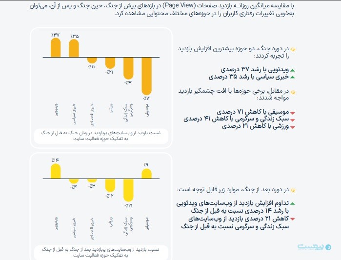 در این گزارش آمده است در دوره جنگ دو حوزه ویدیویی با رشد ۳۷ درصدی و خبری سیاسی با رشد ۳۵ درصدی بیشترین افزایش بازدید را تجربه کردهاند.