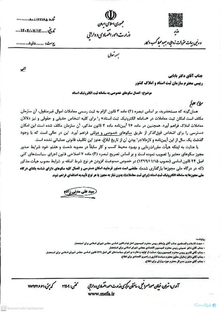 به گزارش پیوست، علی مدنیزاده وزیر امور اقتصادی و دارایی در نامهای رسمی به رئیس سازمان ثبت اسناد و املاک کشور، خواستار فراهم کردن دسترسی سکوهای خصوصی دارای مجوز به سامانه ثبت الکترونیک اسناد شد.