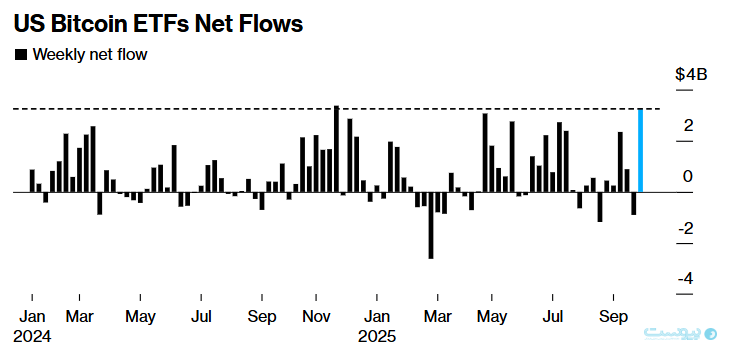 بر اساس دادههای بلومبرگ، صندوقهای قابل معامله بیتکوین در آمریکا (ETF) نیز در هفته گذشته با ورود ۳.۲ میلیارد دلار سرمایه جدید روزهای خوبی را سپری کردهاند و به این ترتیب دومین رقم بزرگ هفتگی از زمان راهاندازی آنها در سال ۲۰۲۴ به این بازار تزریق شده است. در همین حال، ارزش قراردادهای باز در صندوق iShares Bitcoin Trust متعلق به بلکراک به رکورد ۴۹.۸ میلیارد دلار رسیده است.
