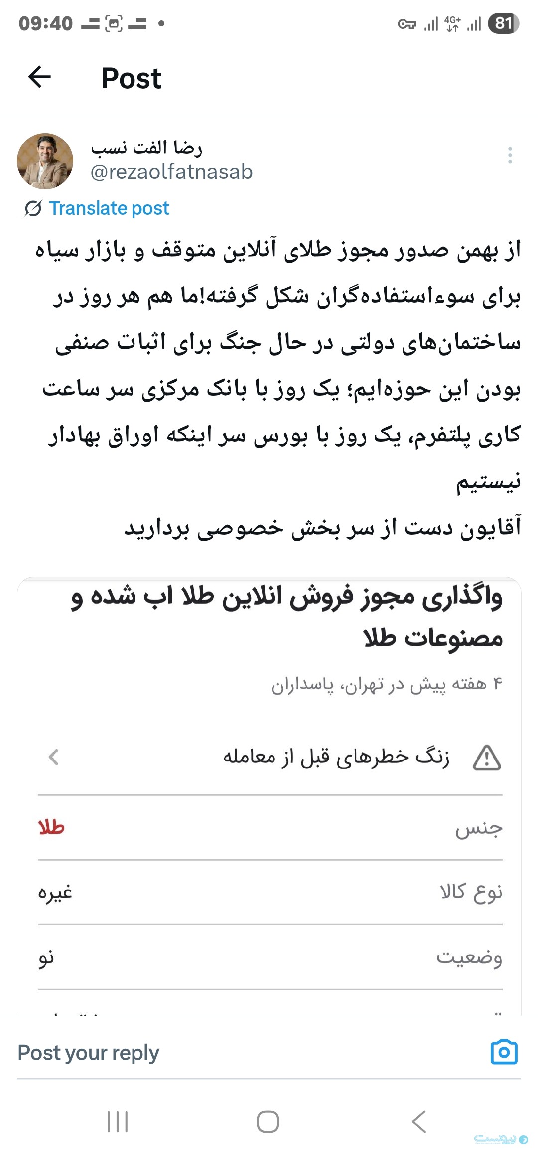 الفتنسب در این توییت نوشته است: «از بهمن صدور مجوز طلای آنلاین متوقف و بازار سیاه برای سوءاستفادهگران شکل گرفته است.ما هم هر روز در ساختمانهای دولتی در حال جنگ برای اثبات صنفی بودن این حوزهایم؛ یک روز با بانک مرکزی سر ساعت کاری پلتفرم، یک روز با بورس سر اینکه اوراق بهادار نیستیم.»