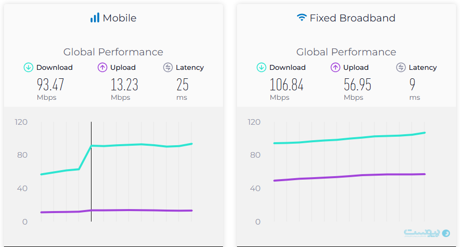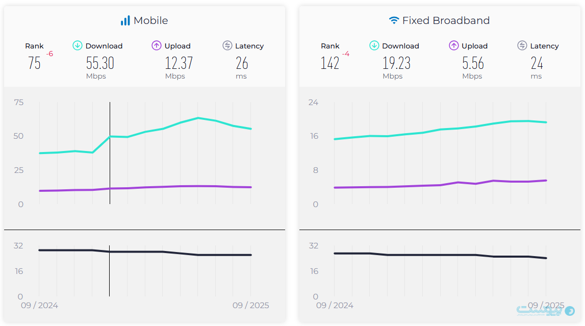 همچنین براساس دادههای اسپیدتست، میانه سرعت اینترنت موبایل در ابتدای سال جاری میلادی (۲۰۲۵) و با معرفی چیپستهای مدرن رشد چشمگیری را تجربه کرده و از ۶۲.۷۹ به ۹۱.۲۷ مگابیت دانلود رسیده است.