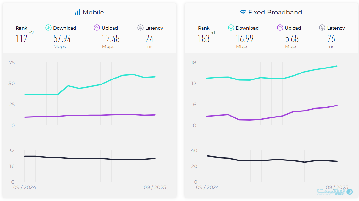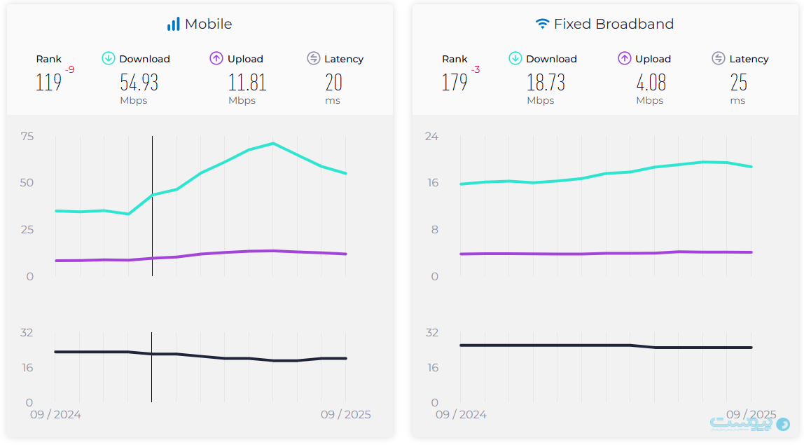 براساس گزارش جدید اسپیدتست (تا ماه سپتامبر ۲۰۲۵) از وضعیت سرعت اینترنت در جهان، اینترنت همراه پایتخت کشورمان با ۹ پله سقوط نسبت به گزارش قبلی در جایگاه ۱۱۹ از میان ۱۵۱ شهر قرار گرفته است و این در حالی است که اینترنت موبایل در شهر مشهد نسبت به گزارش قبلی جایگاه بهتری دارد و حالا با ۲ پله صعود در جایگاه ۱۱۲ قرار گرفته است. اسپیدتست میانه سرعت ۵۷.۹۴ و ۵۴.۹۳ مگابیت را برای مشهد و تهران گزارش میدهد. در نگاه کلی نیز جایگاه ایران با شش پله سقوط در بخش اینترنت موبایل به رتبه ۷۵ با میانه سرعت ۵۵.۳۰ کاهش یافته است.