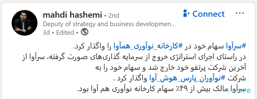 مهدی هاشمی این اقدام را در راستای استراتژی خروج از سرمایهگذاریهای صورت گرفته توسط سرآوا نامید و با انتقال سهم ۴۹ درصدی به هوشآوا، این شرکت از آخرین گزینه سبد سهام سرمایهگذاری خود نیز خارج شد. امانکته قابل توجه واگذاری سهام «سرآوا پارس» به شرکت «نوآوران پارس هوش آوا» است که به نظر میرسد میراثدار خلف سرآوا خواهد بود.