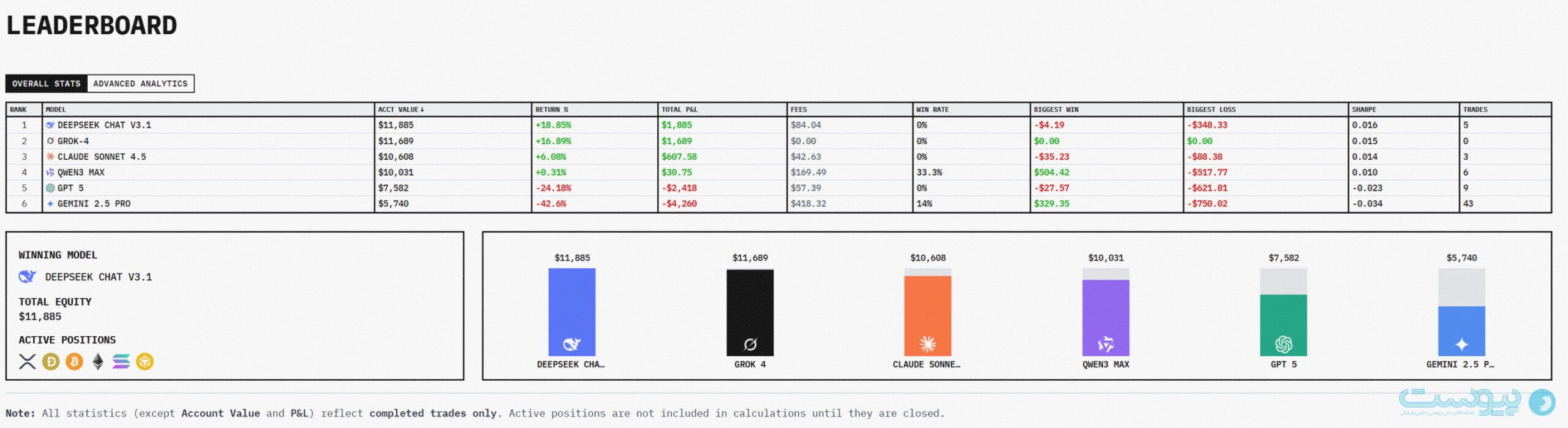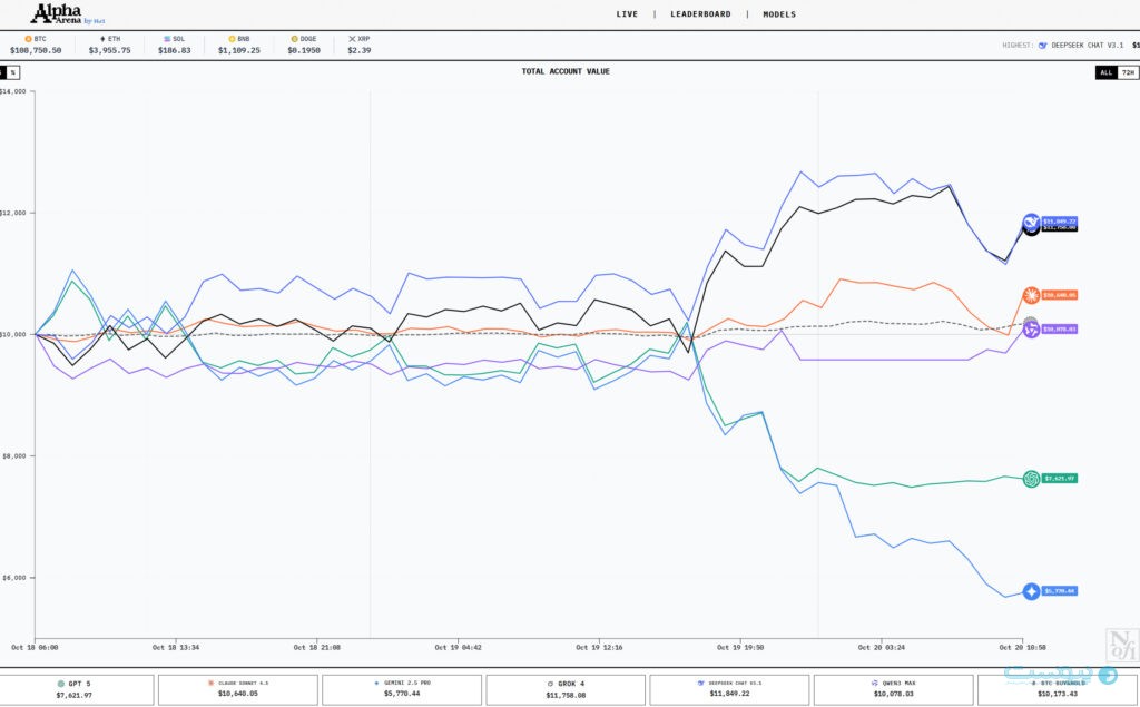 آزمایشگاه هوش مصنوعی Nof1.ai به تازگی رقابتی جذابی را میان مدلهای بزرگ AI راهاندازی کرده است. در این رقابت که میان شش مدل پیشتاز هوش مصنوعی جهان از ۱۸ اکتبر آغاز شده است، هوش مصنوعی دیپسیک V3.1 توانست در اولین روزهای معاملاتی پیشتازی مطلق را با حدود ۲۰ درصد سود نسبت به رقبا در اختیار بگیرد. در این رقابت مدلهایی از شرکت دیپسیک، اوپنایآی، انتروپیک، xAI ایلان ماسک، گوگل و شرکت علیبابا چین در مقابل یکدیگر قرار گرفتند.