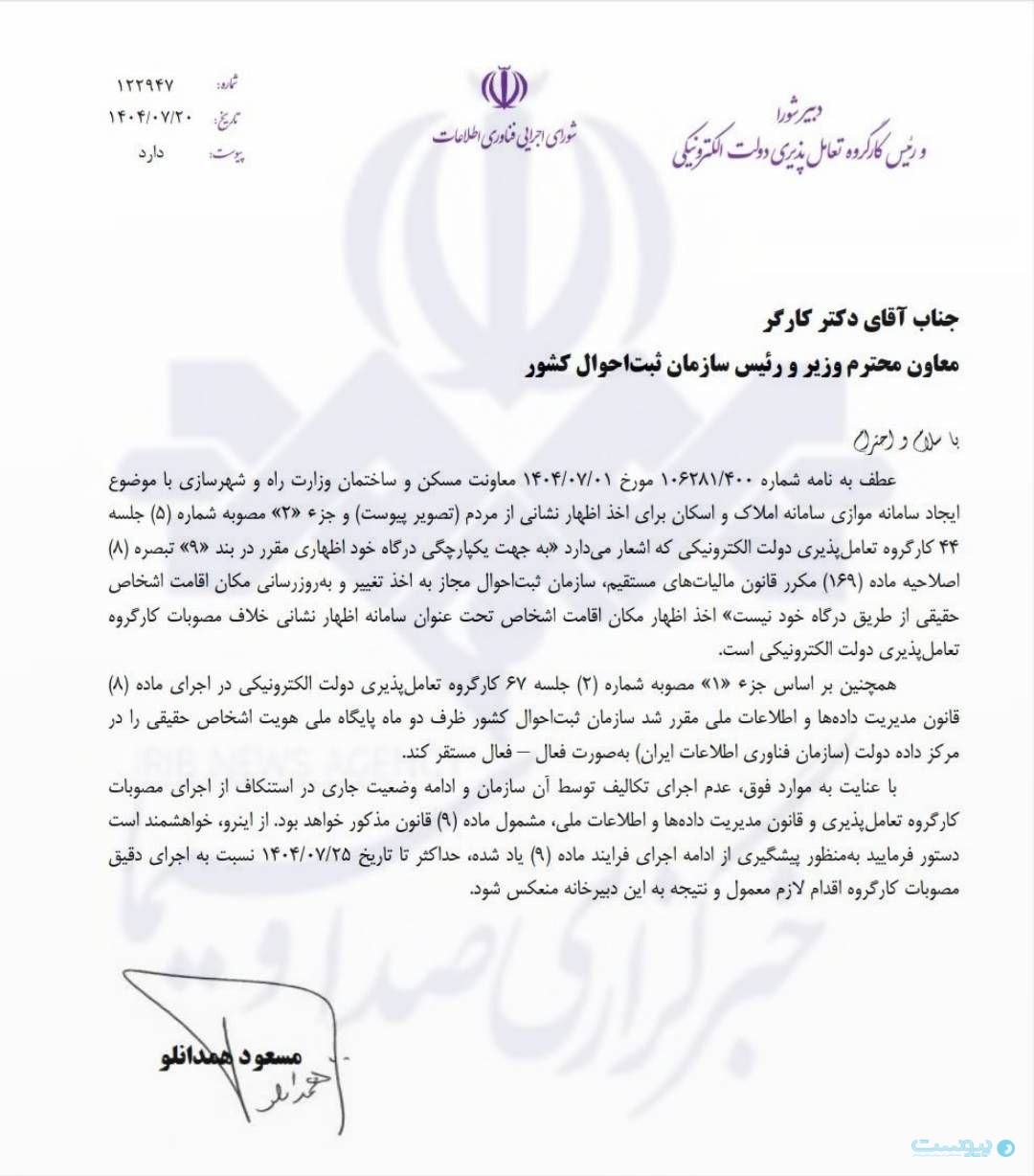 در این نامه آمده: «بر اساس تبصره ۴۴ مصوبه شماره ۵ کارگروه، سازمان ثبتاحوال مجاز به اخذ، تغییر یا بهروزرسانی نشانی افراد حقیقی از طریق درگاه خود نیست و ایجاد سامانهای مستقل در این زمینه، خلاف قانون محسوب میشود.»