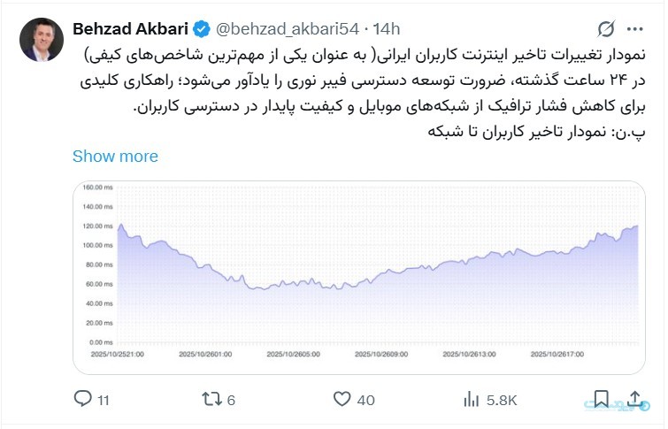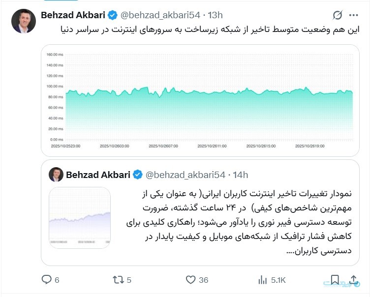 به گزارش پیوست، در توئیت اول، اکبری نمودار متوسط تاخیر دسترسی کاربران ایرانی تا سرورهای داخلی را منتشر کرده؛ نموداری که نشان میدهد در ساعات مختلف شبانهروز، میزان تاخیر با روندی نوسانی و ناپایدار از ۶۰ تا ۱۲۰ میلیثانیه همراه بوده است.