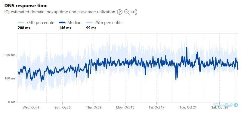 در نمودارهایی که توسط Cloudflare Radar منتشر شدهاند، شاخصهای Latency (زمان رفتوبرگشت داده) و DNS Response Time (زمان پاسخدهی سامانه نام دامنه) برای ایران در بازه ۳۰ روز گذشته به ترتیب حدود ۱۳۶ میلیثانیه و در نمودار دوم حدود ۱۴۶ میلیثانیه ثبت شده است. این اعداد نشان میدهند که حتی در وضعیت عادی، تاخیر شبکه ایران در سطحی قرار دارد که نسبت به استانداردهای جهانی متوسط رو به بالا محسوب میشود؛ بهویژه آنکه در شبکههای بهینه، تاخیر مناسب معمولاً بین ۲۰ تا ۶۰ میلیثانیه است.