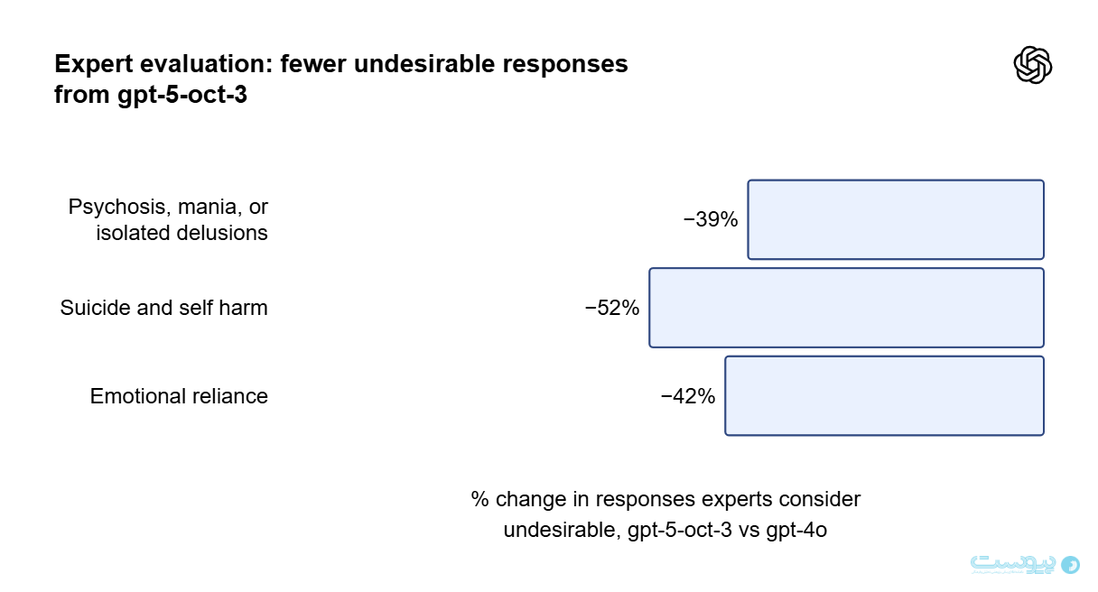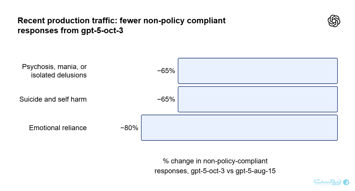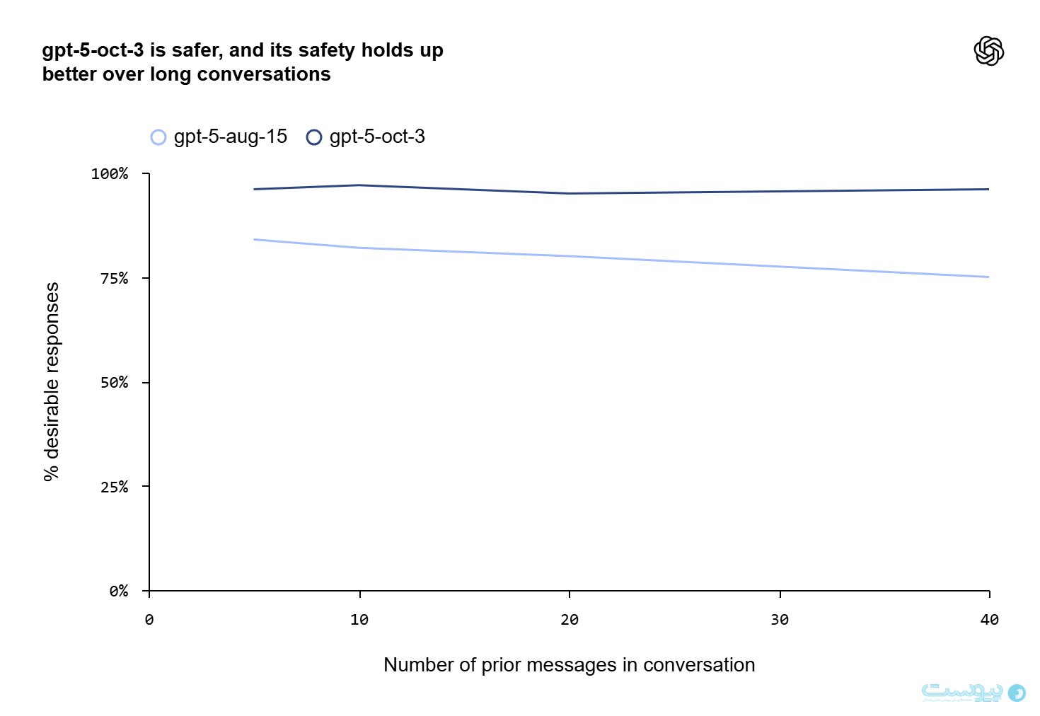 از این رو اوپنایآی در پست وبلاگی خود به بهبود عملکرد مدل جدید زبانی در این رابطه اشاره کرده است. این شرکت میگوید نسخه جدید مدل زبانی آنها یعنی GPT-5، در مقایسه با نسل قبلی در مدیریت مکالمات حساس به شکل قابل توجهی بهبود یافته است و طبق پست وبلاگی اوپنایآی، بروزرسانی سوم اکتبر این مدل زبانی باعث شده تا ایمنی GPT-5 در مکالمههای طولانی نیز حفظ شود.