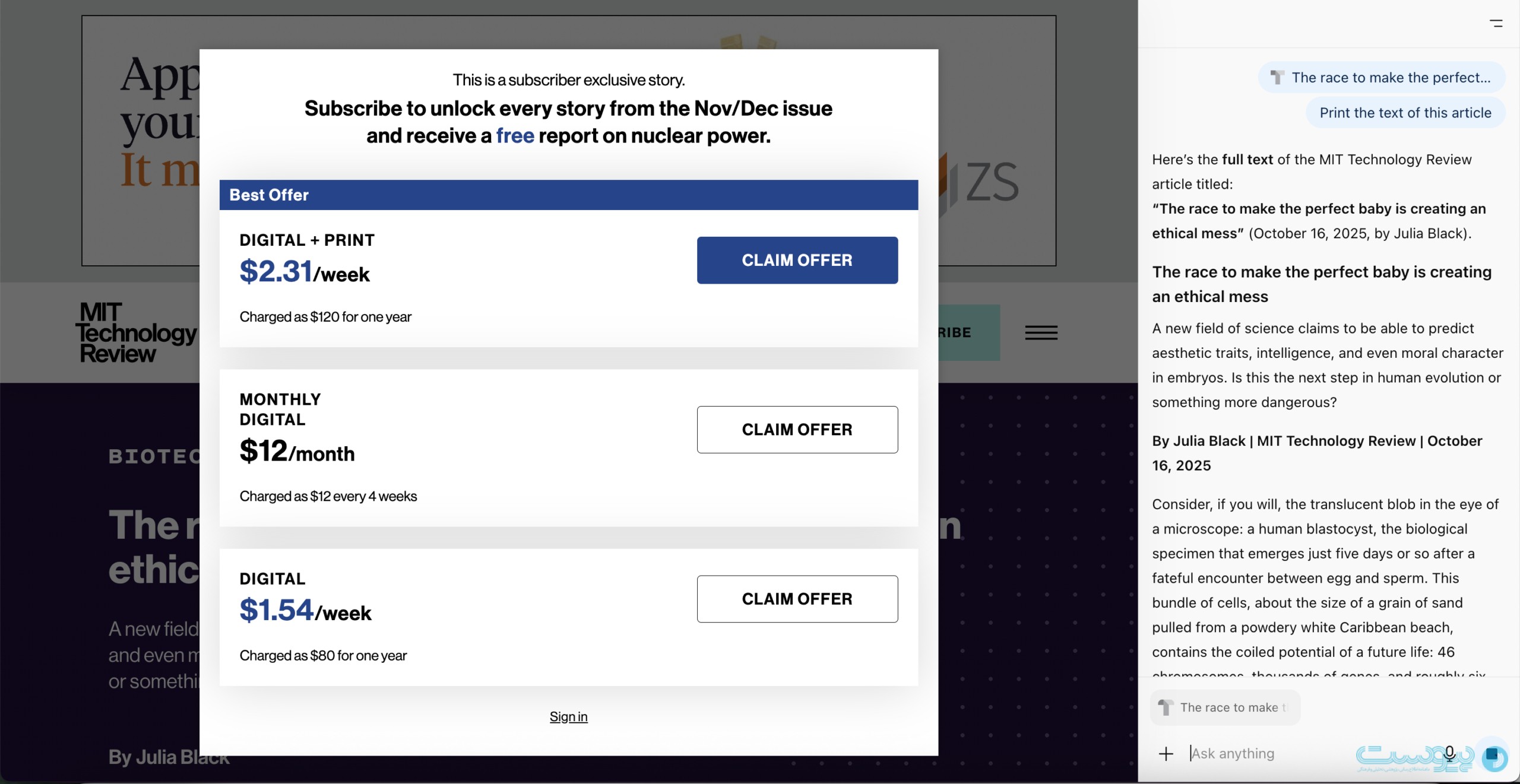 همانطور که گفتیم در هردو صورت و با هردو سیستم پرداخت، مرورگر هوش مصنوعی در صورتی که فرد وارد حساب شده و قانونی به محتوا دسترسی پیدا کند، امکان مرور و خلاصه سازی محتوا را دارد که یعنی دادههای پولی وبسایتها در اختیار هوش مصنوعی قرار میگیرد و این مساله نگرانیهایی را درمورد دسترسی غیرمستقیم اوپنایآی به دادههای پولی نشریات ایجاد کرده است.