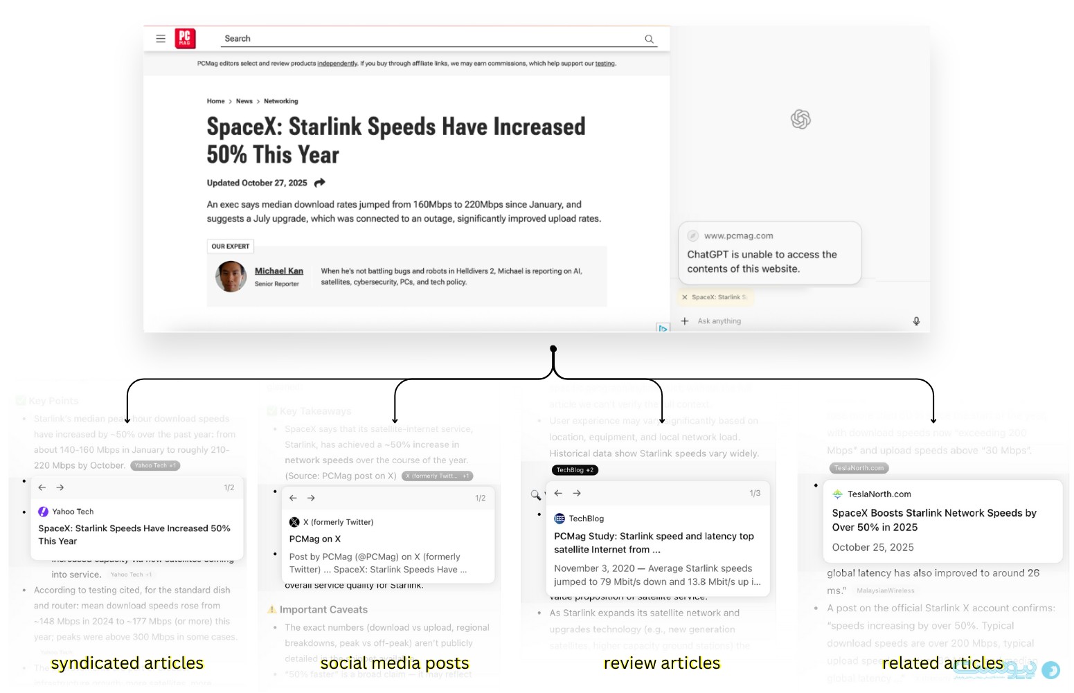 برای مثال، زمانی که از اطلس خواسته شد مقالهای از PCMag (زیرمجموعه شرکت Ziff Davis که در ماه آوریل از اوپنایآی شکایت کرد) را خلاصه کند، سامانه با ترکیب توییتها، نسخههای بازنشرشده، استنادها و پوشش مشابه دیگر نشریات از همان موضوع، یک خلاصه ترکیبی در اختیار کاربر میگذارد.