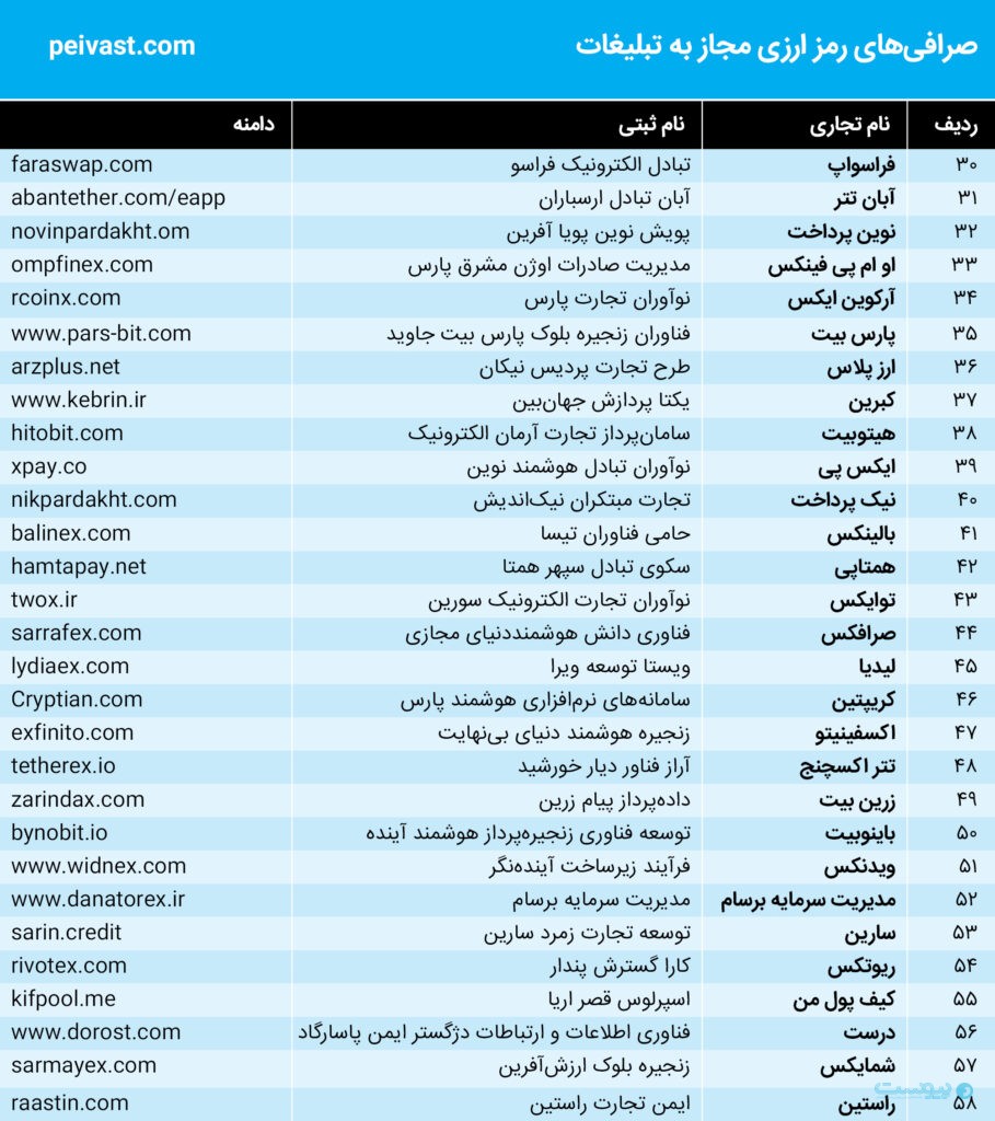 به گزارش پیوست، براساس اطلاعیه انجمن فینتک که در اختیار پیوست قرار گرفته است، این تشکل در روز ۱۳ آبان ۱۴۰۴ با صدور اطلاعیهای فهرستی از پلتفرمهای دارای مجوز جهت انتشار تبلیغات در حوزه رمزداراییها را منتشر کرده است که شامل ۵۸ پلتفرم میشود.
