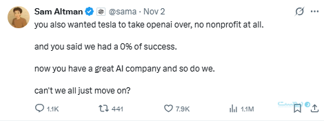 آلتمن همچنین طی پست دیگری در دنباله این جدال لفظی گفت که تسلا قرار بود اوپنایآی را تصاحب کند و خبری هم از حفظ ماهیت غیرانتفاعی و عامالمنفعه آن نبود.