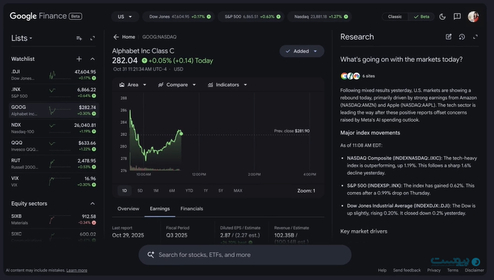گوگل همچنین در هفته گذشته ویژگیهای جدیدی برای پایش سود شرکتها عرضه کرد که شامل پخش زنده صوتی جلسات اعلام درآمد، رونوشت لحظهای و تحلیلهای خودکار هوش مصنوعی از گزارشهای مالی میشود. قابلیت «در یک نگاه» نیز بهطور مداوم با دادههای خبری و واکنش تحلیلگران بهروزرسانی میشود.