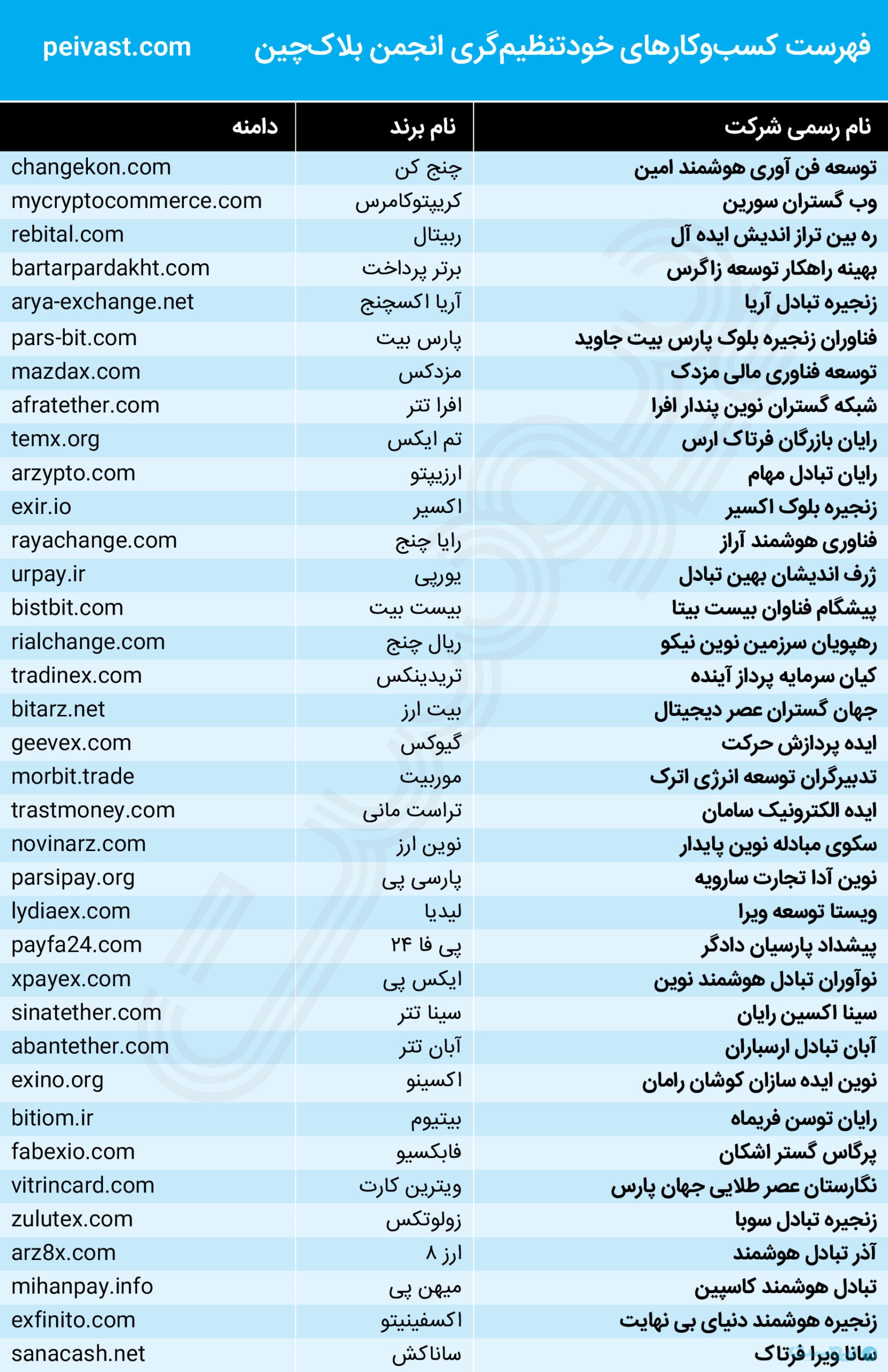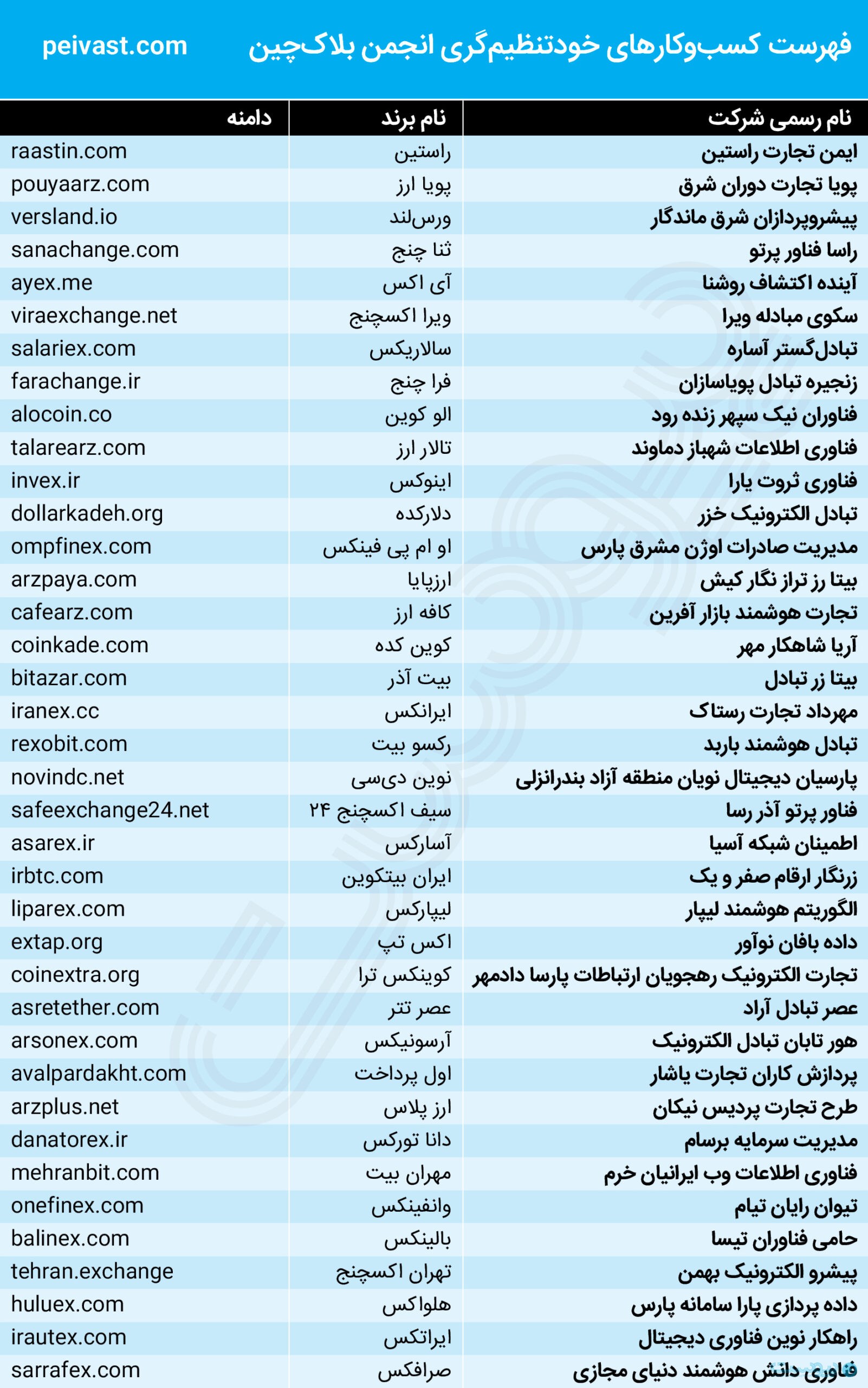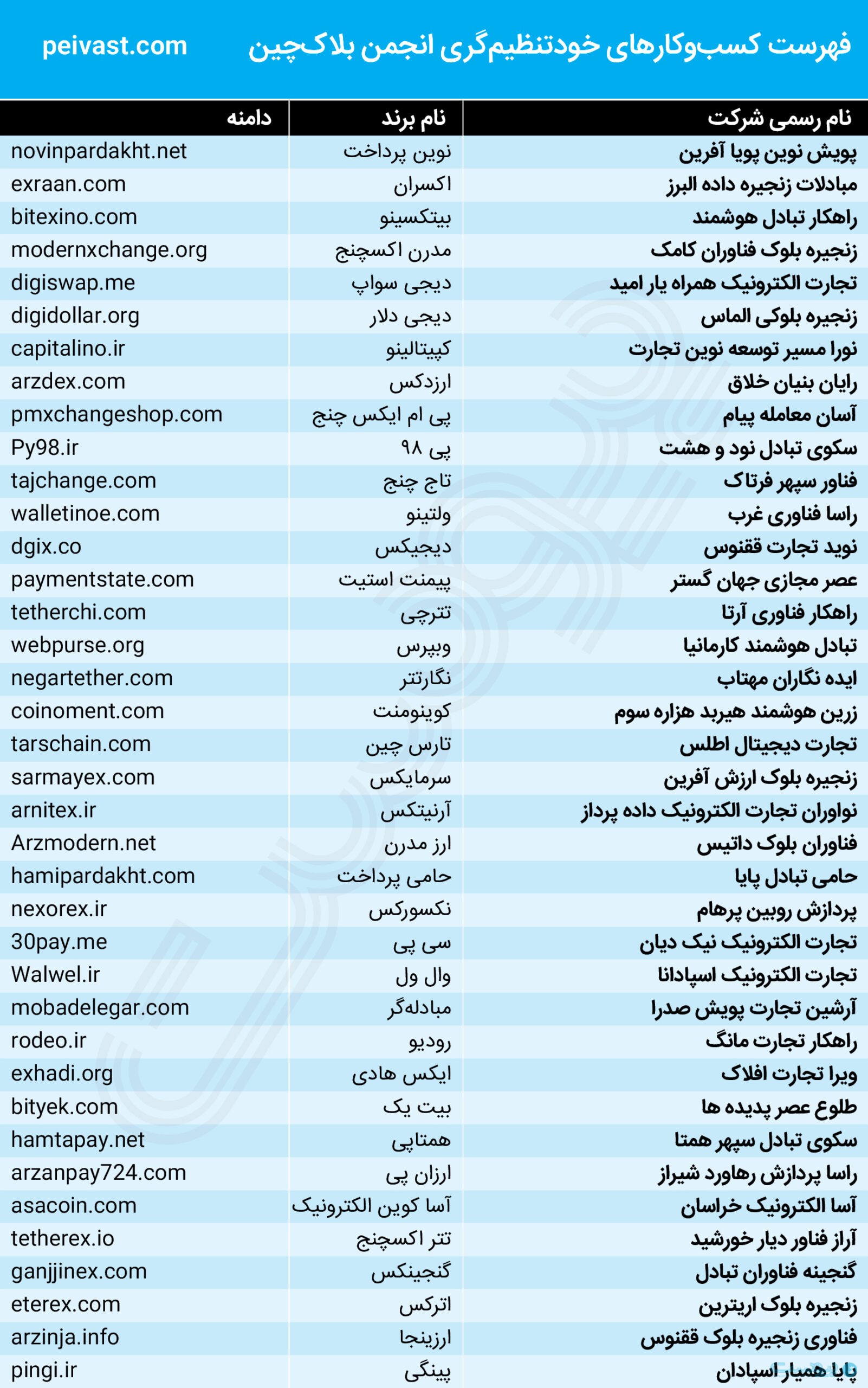 به گزارش کمیته خودتنظیمگری انجمن بلاکچین، فهرست مذکور شامل کسبوکارهایی است که در زمان انتشار، الزامات تبلیغاتی مسئولانه و ضوابط شفافیت را رعایت کردهاند. این فهرست بر اساس مکاتبات رسمی با معاونت تبلیغات وزارت فرهنگ و ارشاد اسلامی و در چارچوب نظام خودتنظیمگری انجمن منتشر شده است.