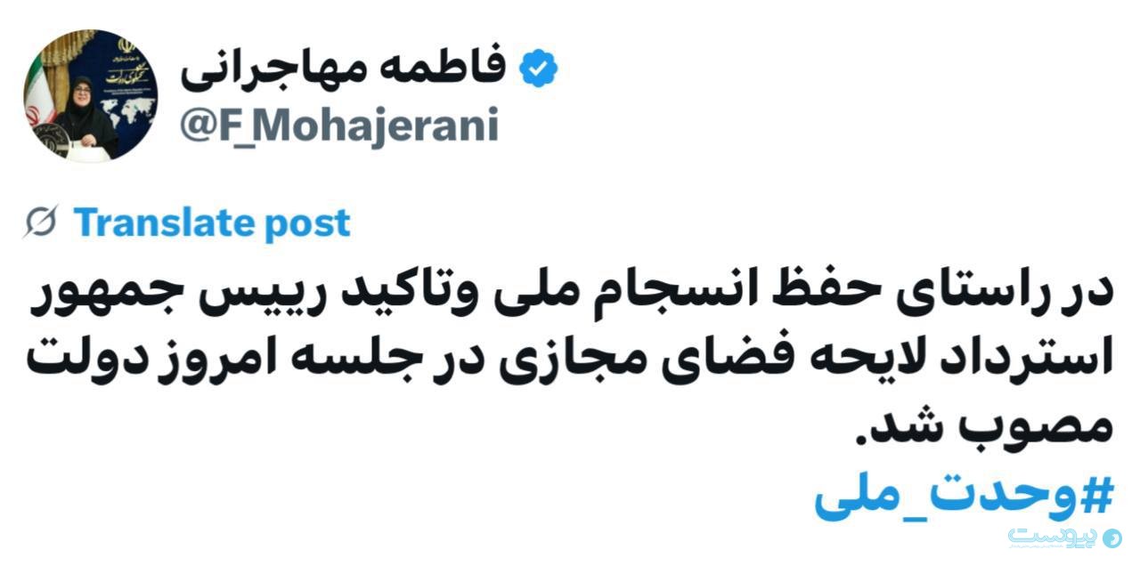 به گزارش پیوست، فاطمه مهاجرانی، سخنگوی دولت، امروز پس از جلسه هیات دولت گفت: لایحه «مقابله با نشر محتوای خلاف واقع در فضای مجازی» در کارگروهی در حال بررسی است و امیدواریم که هرچه زودتر به خروجی برسد. به گفته او همچنین این لایحه بیش از هر چیز به دنبال حمایت از اهالی رسانه است.