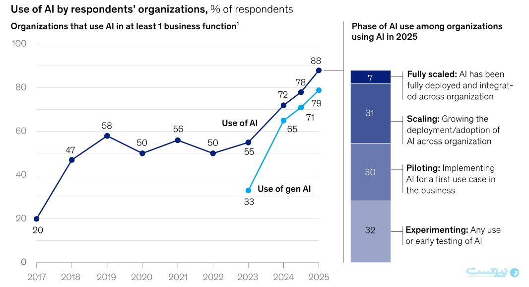 آخرین نظرسنجی نشان میدهد که سهم بیشتری از پاسخدهندگان گزارش میکنند سازمانشان از هوش مصنوعی استفاده میکند، هرچند بیشتر آنها هنوز این فناوریها را در مقیاس گسترده پیادهسازی نکردهاند. سهم افرادی که میگویند سازمانشان دستکم در یکی از واحدهای کسبوکار از هوش مصنوعی استفاده میکند نسبت به سال گذشته افزایش یافته است: اکنون ۸۸ درصد گزارش میکنند که بهطور منظم در حداقل یکی از بخشهای کسبوکار از هوش مصنوعی استفاده میشود، در حالی که این رقم سال گذشته ۷۸ درصد بود. با این حال، در سطح سازمانی، اکثریت همچنان در مرحله آزمایش یا اجرای پایلوت قرار دارند و در نمودار زیر قابل مشاهده است؛ و تنها حدود یکسوم گزارش میدهند که شرکتشان شروع به مقیاسبندی برنامههای هوش مصنوعی کرده است.