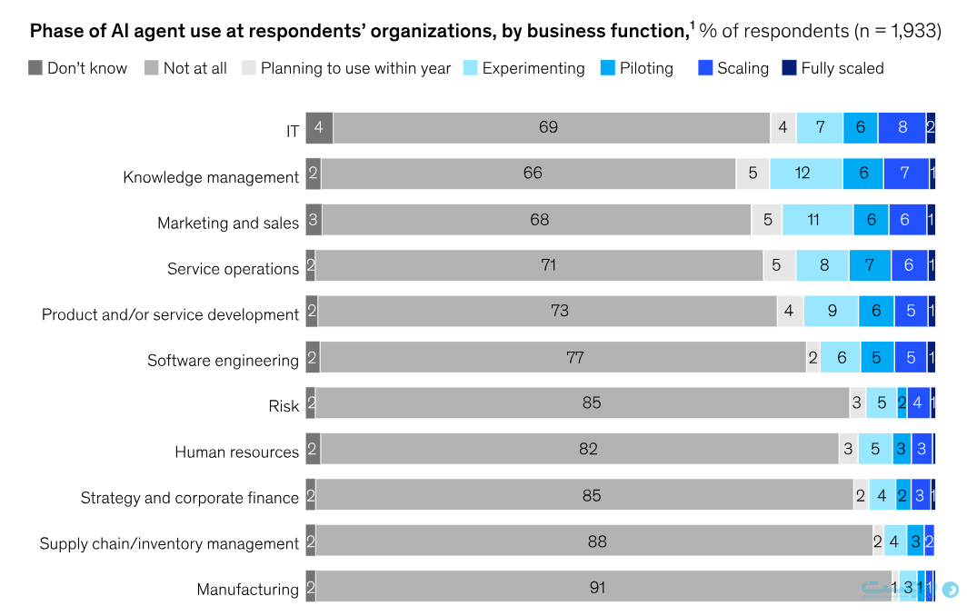 به طور کلی، هوش مصنوعی عاملمحور در ماههای اخیر با موجی از هیجان و توجه گسترده روبهرو شده است. بر اساس نتایج نظرسنجی در گزارش مککینزی، حدود یکچهارم پاسخدهندگان اعلام کردهاند که دستکم یک سامانه هوش مصنوعی عاملمحور را در مقیاس سازمانی به کار گرفتهاند، هرچند این استفاده معمولاً به یک یا دو کارکرد کسبوکار محدود میشود. با نگاهی به کل فضای سازمانی، میتوان دید که کاربرد ایحنتهای هوش مصنوعی هنوز فراگیر نشده است. این فاصله، تضاد میان ظرفیت بالایی را که در قالب «چرخه بزرگنمایی و هیجان» مطرح میشود و واقعیت عملی موجود نشان میدهد. در شرکتهایی که به گفته پاسخدهندگان استفاده از عوامل هوش مصنوعی را در یک کارکرد مشخص آغاز کردهاند، اغلب این تلاشها هنوز در مرحله آزمایشی و اکتشافی قرار دارد و پیادهسازی موفق ایجنتهای هوش مصنوعی مستلزم تلاش جدی و کار دقیق است.