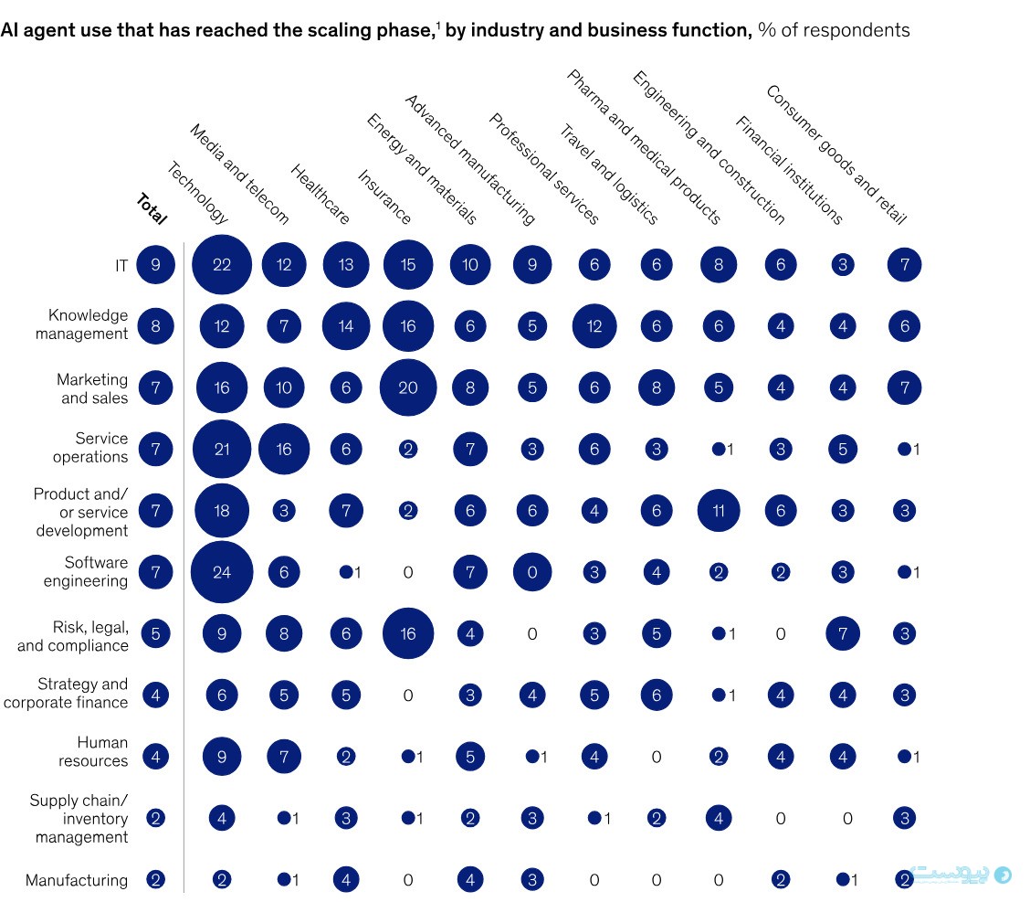 ۹۰ درصد شرکتهای بزرگ دنیا نزدیک به سه سال پس از معرفی ابزارهای هوش مصنوعی مولد، بهطور منظم از این فناوری استفاده میکنند. با این حال، تنها یکسوم آنها توانستهاند هوش مصنوعی را در سطح کل سازمان به مقیاس برسانند و از مزایای واقعی آن بهرهمند شوند. یافتهها همچنین نشان میدهد که بیش از ۶۰ درصد سازمانها در حال آزمایش ایجنتهای هوش مصنوعی هستند. سیستمهایی که قادرند چندین مرحله از یک گردش کار را خودکار انجام دهند اما استفاده گسترده از آنها هنوز محدود است.