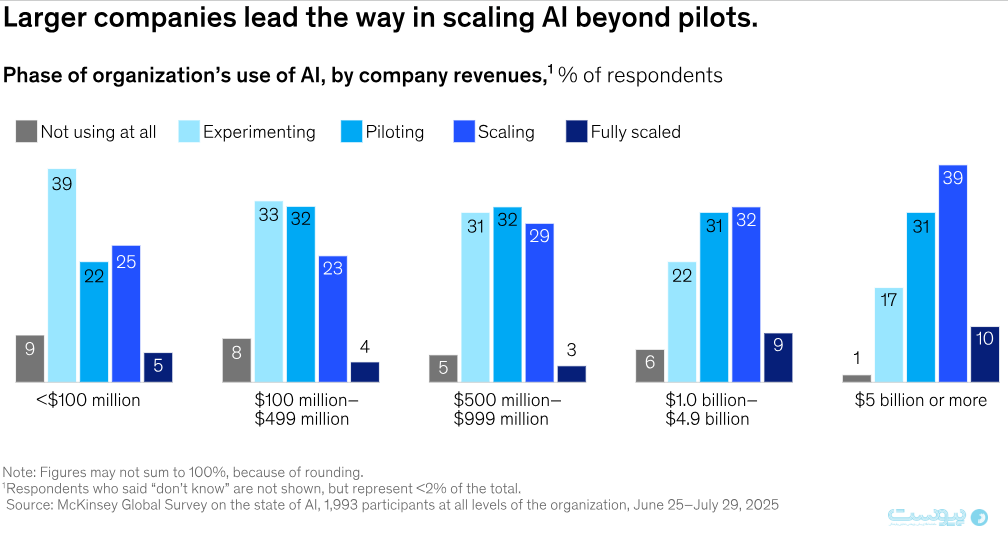 با این حال، بسیاری از شرکتها بهویژه شرکتهای کوچکتر، هنوز موفق نشدهاند هوش مصنوعی را بهطور عمیق در جریانهای کاری خود یکپارچه کنند. در حالی که تنها یکسوم از کل پاسخدهندگان گفتهاند که برنامههای هوش مصنوعی خود را در سطح کل سازمان در حال مقیاسدهی هستند، شرکتهای بزرگتر هم از نظر درآمد و هم تعداد کارکنان احتمال بیشتری دارد که به این مرحله رسیده باشند.