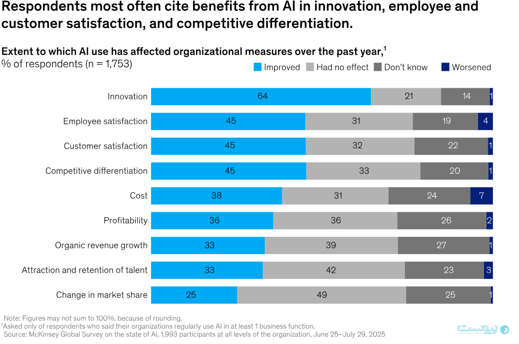 پاسخها نشان میدهد که برای اغلب سازمانها، استفاده از هوش مصنوعی هنوز تأثیر چشمگیری بر EBIT کل شرکت نداشته است. ۳۹ درصد از پاسخدهندگان هر سطحی از تأثیر هوش مصنوعی بر EBIT را گزارش کردهاند و بیشتر آنها گفتهاند که کمتر از ۵ درصد از EBIT سازمانشان به استفاده از هوش مصنوعی نسبت داده میشود. با این حال، پاسخدهندگان به نتایج کیفی مهمی در سطح کل شرکت اشاره میکنند: اکثریت معتقدند استفاده از هوش مصنوعی موجب بهبود نوآوری شده و نزدیک به نیمی نیز از افزایش رضایت مشتری و تقویت تمایز رقابتی گزارش دادهاند.