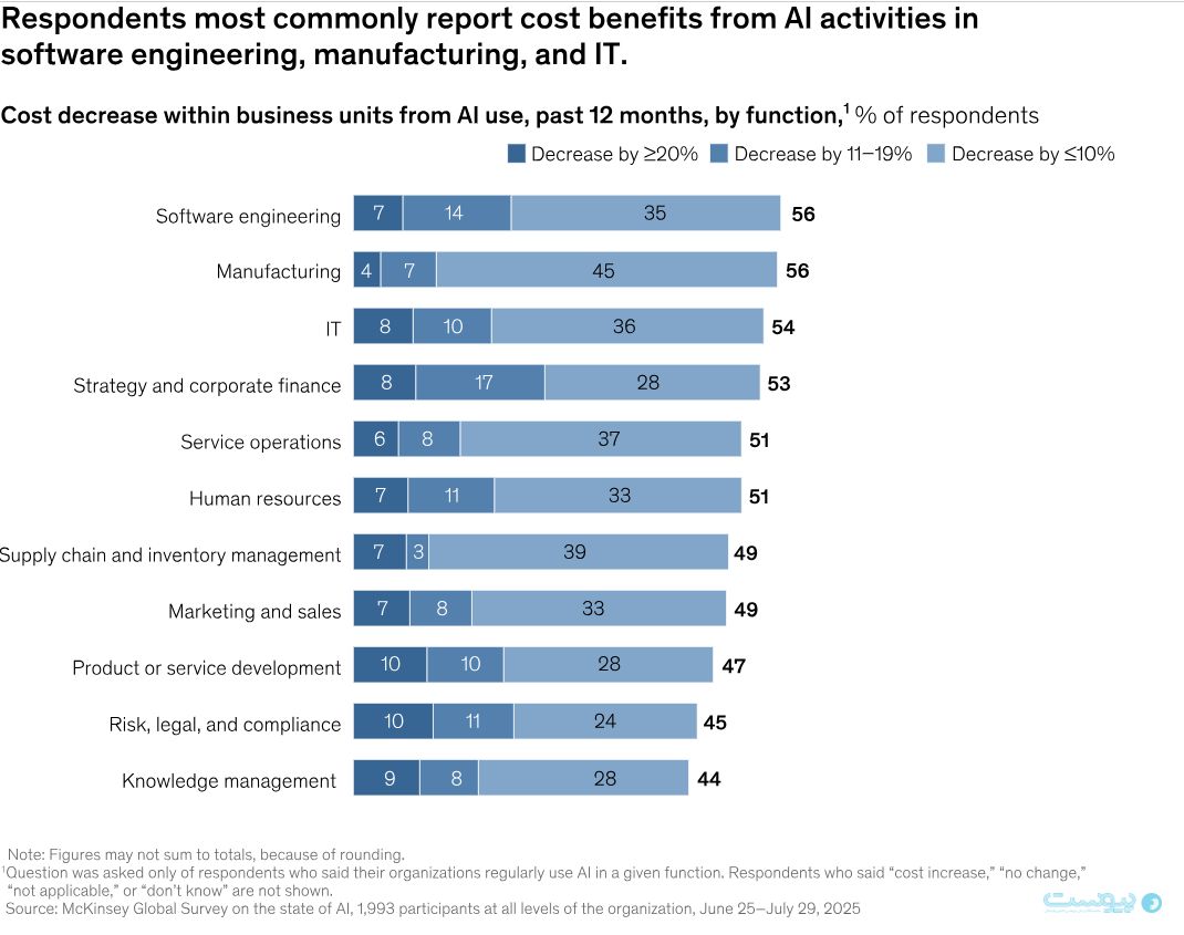 اگرچه موارد گزارششده از تأثیر هوش مصنوعی بر EBIT در سطح کل سازمان محدود است، بسیاری از پاسخدهندگان اعلام کردهاند که از کاربردهای مشخص هوش مصنوعی صرفهجویی در هزینه بهویژه در حوزههای مهندسی نرمافزار، تولید و فناوری اطلاعات در نمودار زیر، نتایج را مشاهده میکنند.