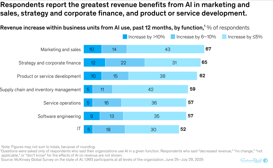 بیشترین افزایش درآمد ناشی از استفاده از هوش مصنوعی در کاربردهایی گزارش شده که مربوط به بازاریابی و فروش، استراتژی و امور مالی شرکتی و توسعه محصول و خدمات هستند؛ این روند با مشاهدات سالهای گذشته ما در طول انجام این نظرسنجی در این نمودار، همخوانی دارد.