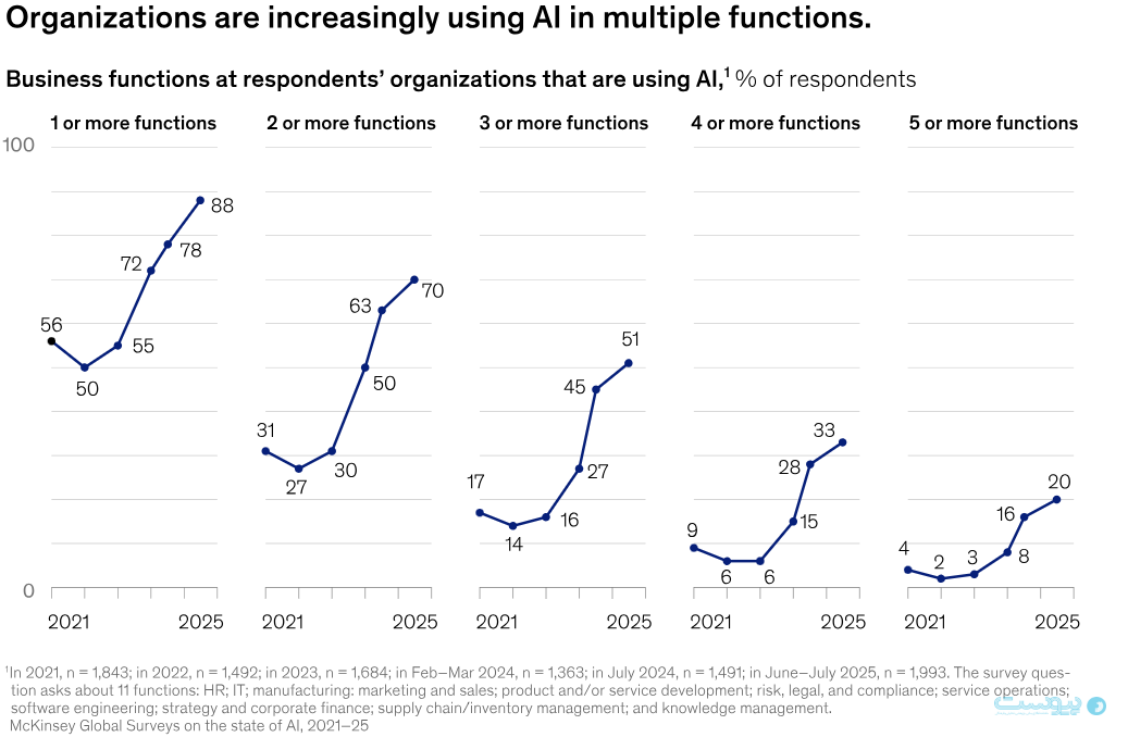 سه سال پس از معرفی ابزارهای هوش مصنوعی مولد (Gen AI) که دوران جدیدی از هوش مصنوعی را رقم زد، نزدیک به ۹ نفر از هر ۱۰ شرکتکننده در نظرسنجی میگویند سازمانشان بهطور منظم از هوش مصنوعی استفاده میکند.اما سرعت پیشرفت در میان آنها یکسان نیست. در حالی که ابزارهای هوش مصنوعی اکنون به امری رایج تبدیل شدهاند، بیشتر سازمانها هنوز آن را بهطور عمیق در جریانهای کاری و فرآیندهای خود نهادینه نکردهاند تا از مزایای واقعی در سطح سازمانی بهرهمند شوند. آخرین نظرسنجی جهانی مککینزی درباره وضعیت هوش مصنوعی، چشماندازی را ترسیم میکند که هم با گسترش استفاده از جمله افزایش کاربرد هوش مصنوعی عاملمحور و هم با چالشهای رشد تدریجی همراه است؛ چرا که گذار از مرحله آزمایشی به مقیاس واقعی در بیشتر سازمانها هنوز در حال انجام است.