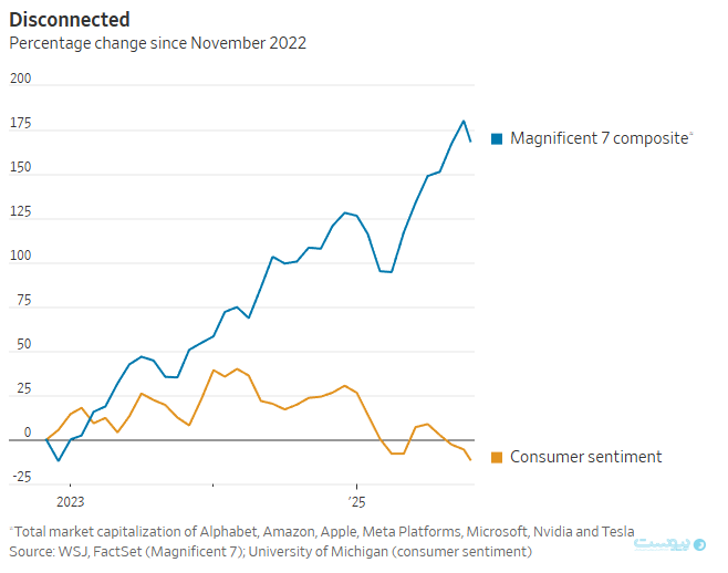 از زمان انتشار ChatGPT در سال ۲۰۲۲، ارزش بازار «هفت شگفتانگیز» بورس آمریکا که انویدیا، مایکروسافت و متا را شامل میشود، ۱۶۹ درصد افزایش یافته است و این موج سرمایهگذاری به رشد قابلتوجهی در اقتصاد آمریکا دامن زده به طوری که عمده رشد تولید ناخالص داخلی ایالات متحده در سال جاری را توسعه و احداث زیرساخت هوش مصنوعی رقم زده است. با این حال، شاخص اعتماد مصرفکننده دانشگاه میشیگان نزدیک به رکوردهای منفی تاریخی است.