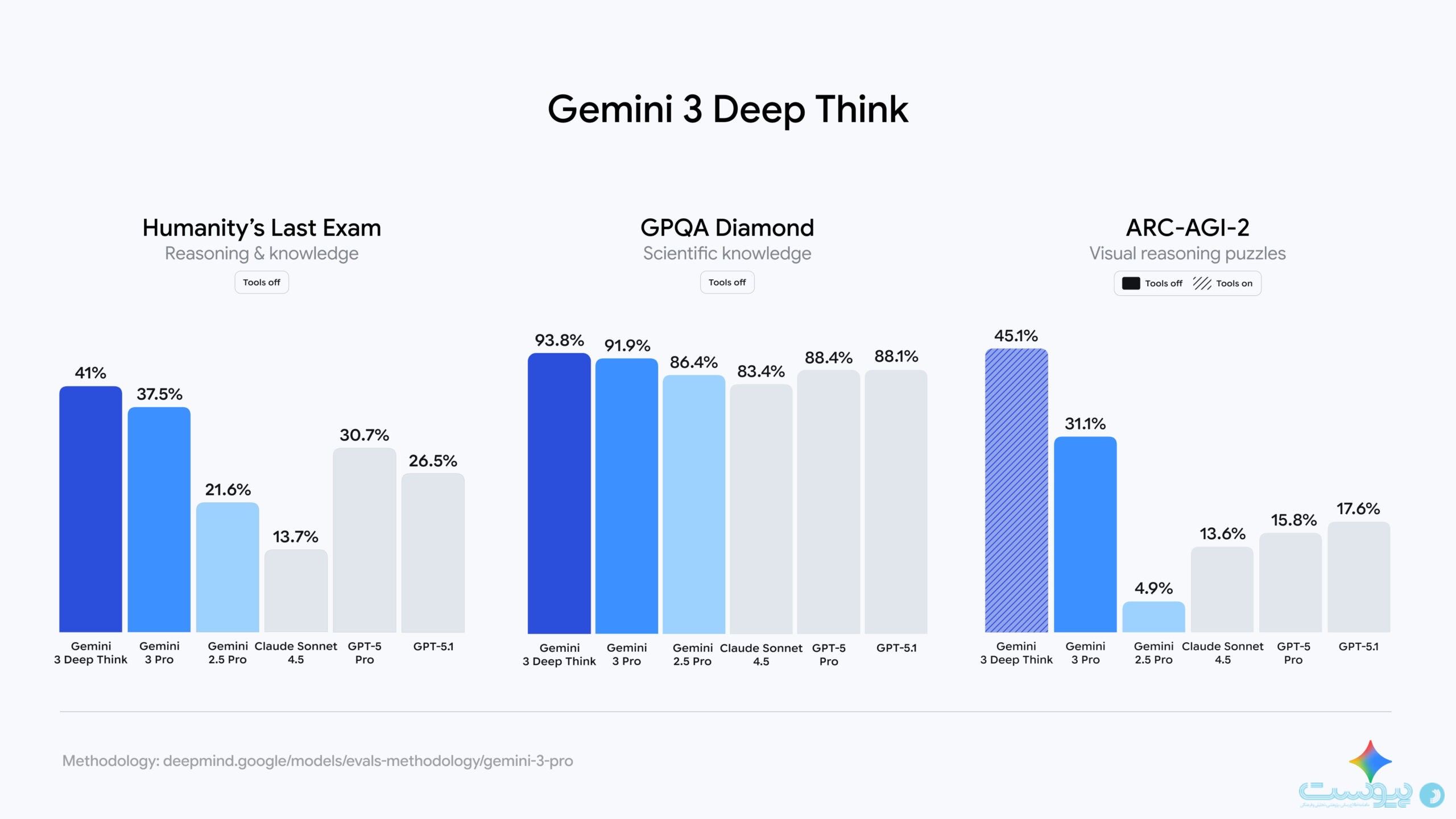 مدل جدید شرکت گوگل، به حالت تفکر عمیق یا Deep Think مجهز شده که البته هنوز در اختیار کاربران قرار ندارد و پس از تست ایمنی برای مشترکان نسخه Ultra عرضه میشود. گوگل میگوید این حالت که به استدلال عمیقتر میپردازد در تستهای حل مسئلهی نوین (مانند ARC-AGI-2) رکوردهای قبلی را جابجا کرده است.
