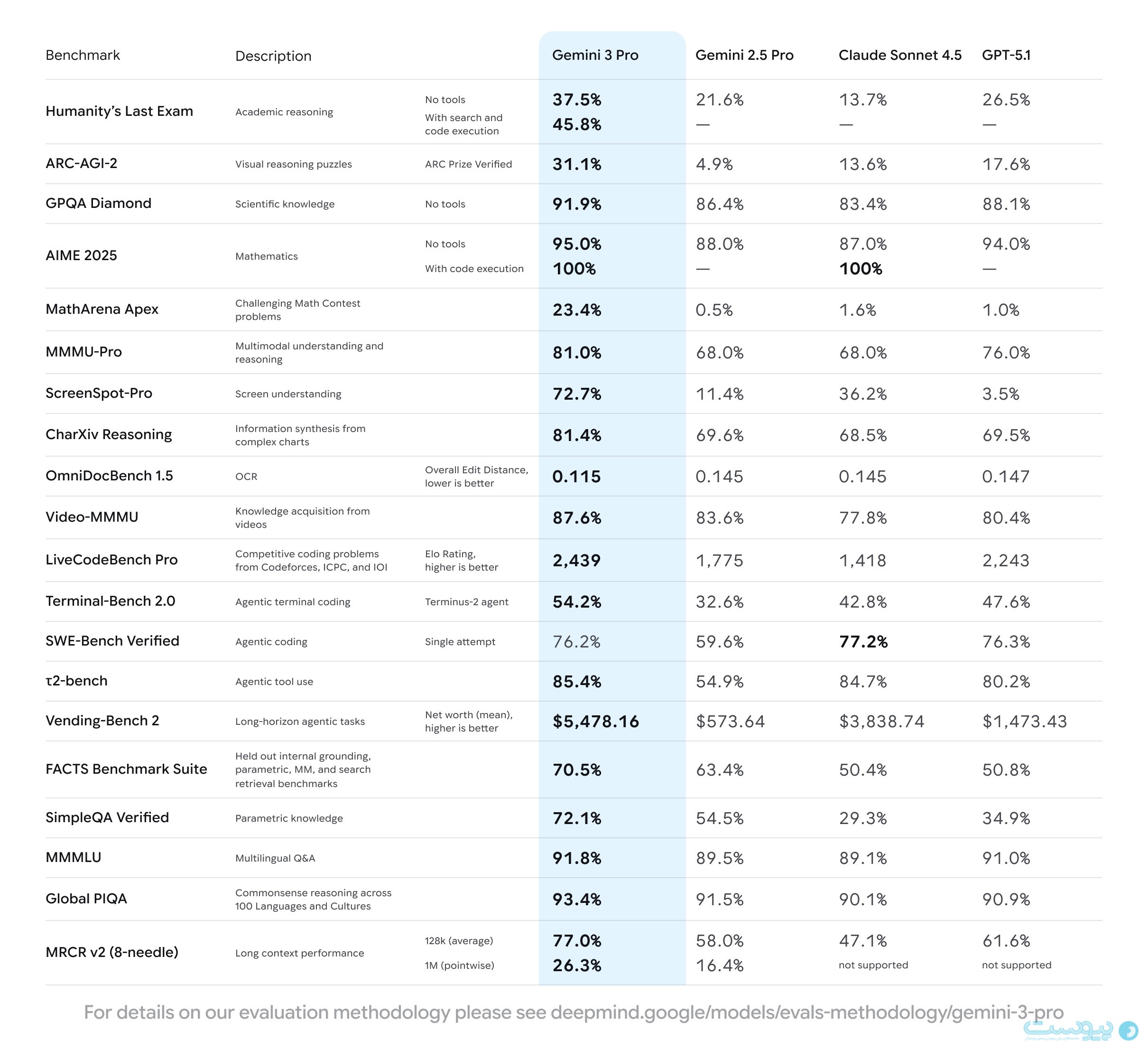 نسخه پیشرفته این مدل یا Gemini 3 Pro، که از همین حالا در دسترس مشترکان پولی شرکت قرار گرفته، بر اساس بنچمارکها، مدل قبلی (2.5 Pro) را در تمامی زمینهها شکست میدهد. این مدل همچنین در ردهبندی LMArena که عملکرد مدلهای زبانی را مورد بررسی قرار میدهد با کسب امتیاز حیرتانگیز ۱۵۰۱ Elo در صدر قرار دارد.
