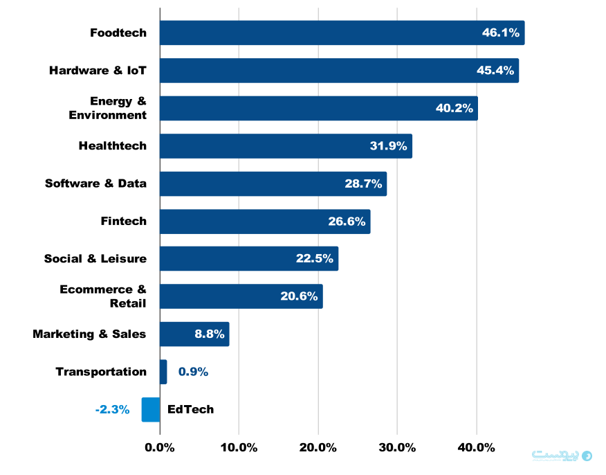 مقایسه تعداد استارتآپها بین سالهای ۲۰۲۴ و ۲۰۲۵ در ۱۱ صنعت کلیدی نشان میدهد فناوری غذایی، سختافزار و اینترنت اشیا، و انرژی و محیط زیست، با رشد بیش از ۴۰درصد، سریعترین بخشها هستند. در مقابل، حمل و نقل با افزایش کمتر از ۱درصد کندترین رشد مثبت را تجربه کرده و فناوری آموزشی تنها صنعتی است که با کاهش ۲.۳درصد روبهرو شده است. این روندها نشان میدهد که فناوریهای سبز و نوآوریهای سختافزاری، موتور اصلی اکوسیستم استارتآپی جهانی محسوب میشوند.