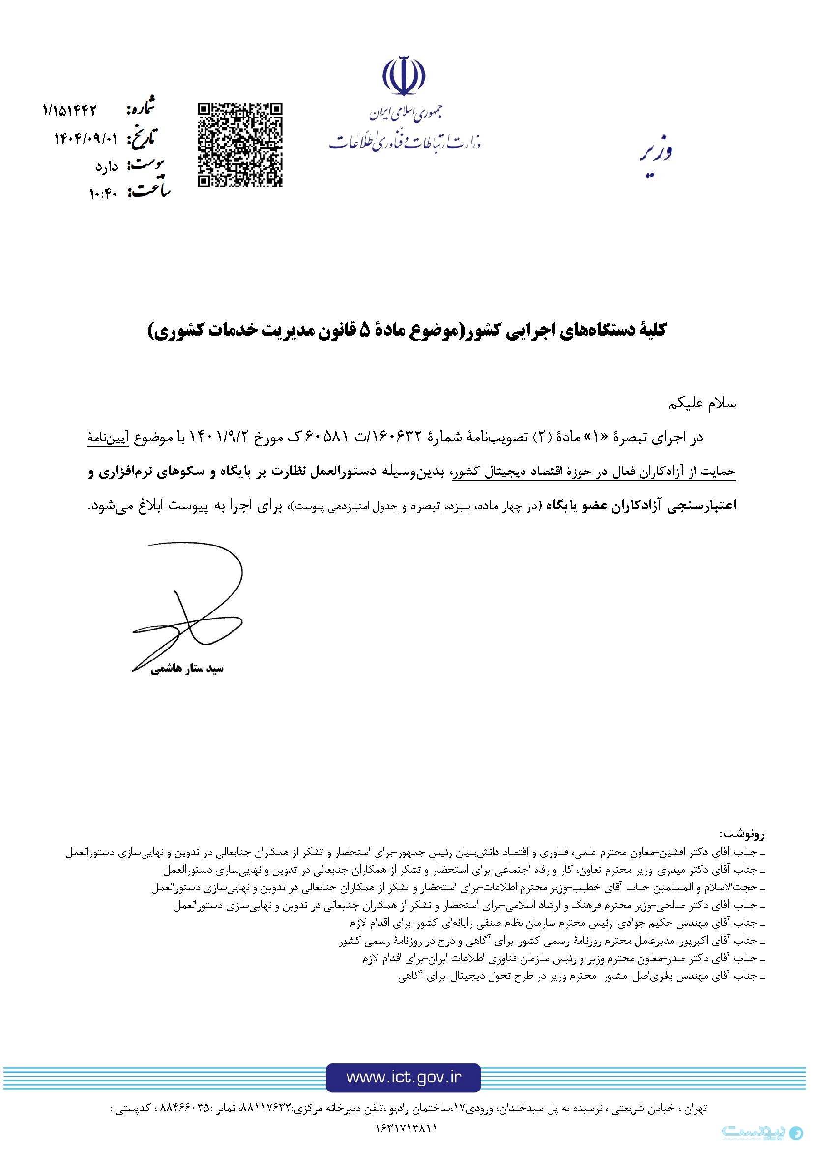 طبق گفته رضا باقری اصل رئیس مرکز تحول دیجیتال و فناوری اطلاعات سازمان برنامه و بودجه کشور وظیفه نظارت و بررسی در این دستورالعمل به صورت کامل به بخش خصوصی واگذار شده است و این دستورالعمل نحوه همکاری آزادکاران یا فریلنسرها با بخشهای دولتی و خصوصی را مشخص کرده و میخواهد مسیر فعالیت فریلنسرها را هموار کند.