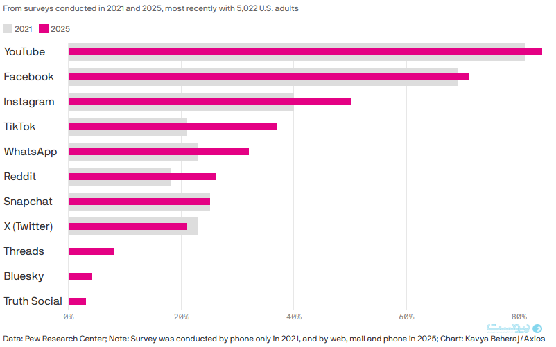 به گزارش پیوست، این گزارش که براساس نظرسنجی از ۵۰۲۲ بزرگسال آمریکایی بین ۵ فوریه تا ۱۸ ژوئن تهیه شده، نشان میدهد یوتیوب، فیسبوک و اینستاگرام همچنان ستونهای اصلی شبکههای اجتماعی در آمریکا هستند. به ترتیب ۸۴ درصد، ۷۱ درصد و ۵۰ درصد از پاسخدهندگان اعلام کردهاند از این سه پلتفرم استفاده میکنند.