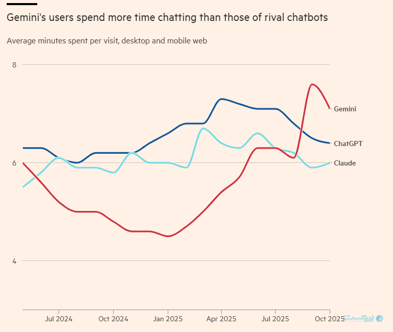 با وجود اینکه اوپنایآی براساس آخرین آمارها همچنان ۸۰۰ میلیون کاربر هفتگی دارد و ChatGPT محبوبترین اپلیکیشن هوش مصنوعی باقی مانده است، اما دادههای Similarweb نشان میدهد کاربران اکنون زمان بیشتری را در هوش مصنوعی جمینای سپری میکنند.
