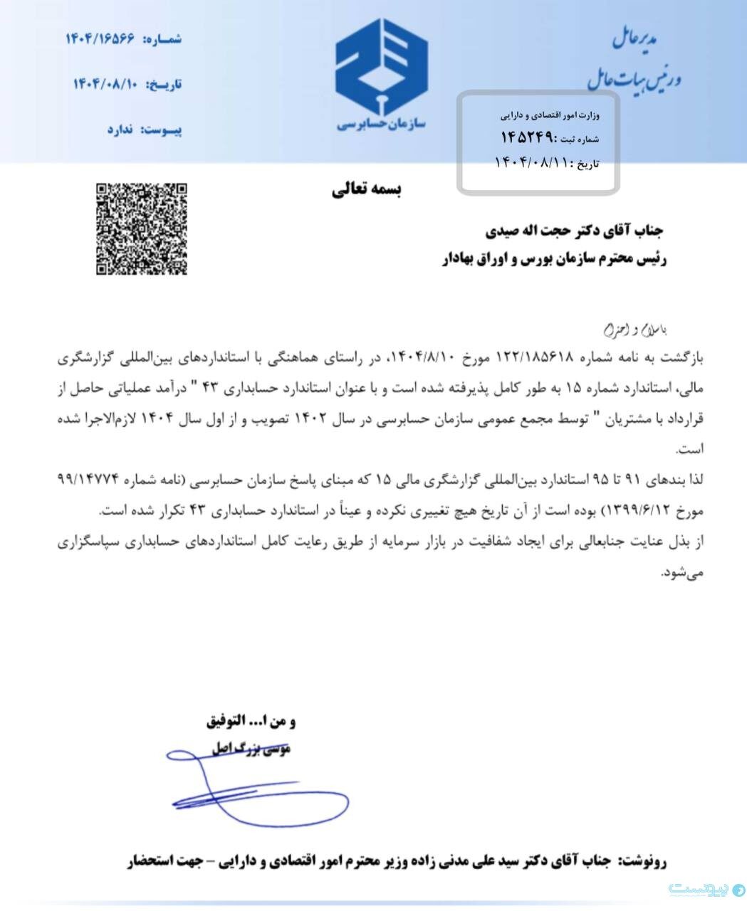 همچنین سازمان حسابرسی در نامهای به سازمان بورس به تاریخ ۸ آبان ۱۴۰۴ اعلام کرد استانداردهای حسابداری ۱۵ و ۴۳ از ابتدای ۱۴۰۴ بدون تغییر لازمالاجرا هستند و پاسخ سال ۱۳۹۹ درباره استانداردهای مرتبط همچنان معتبر است. این نهاد همچنین بر رعایت کامل استانداردها برای افزایش شفافیت بازار سرمایه تأکید کرد.