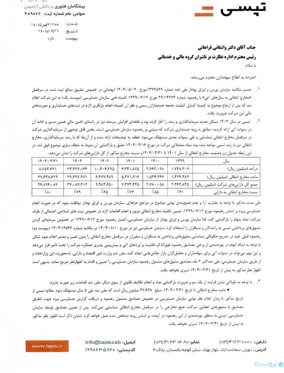 طبق نامههای منتشر شده از سمت تپسی روی سامانه کدال، براساس مکاتبه سازمان بورس و اوراق بهادار بهتاریخ ۴ مردادماه ۱۴۰۴ ابهاماتی در خصوص تطبیق مبالغ ثبت شده در سرفصل مخارج انتقالی به سالهای آتی با رهنمود به شماره ۹۹/۱۴۷۷۴ به تاریخ ۱۲ شهریور ۱۳۹۹ کمیته فنی سازمان حسابرسی به این شرکت اعلام شد که پس از ارجاع موضوع به کمیته کنترل کیفیت جامعه حسابداران رسمی و نظر آن کمیته، انجام بازنگری لازم در ثبتهای حسابداری و صورتهای مالی این شرکت ضرورت یافت.
