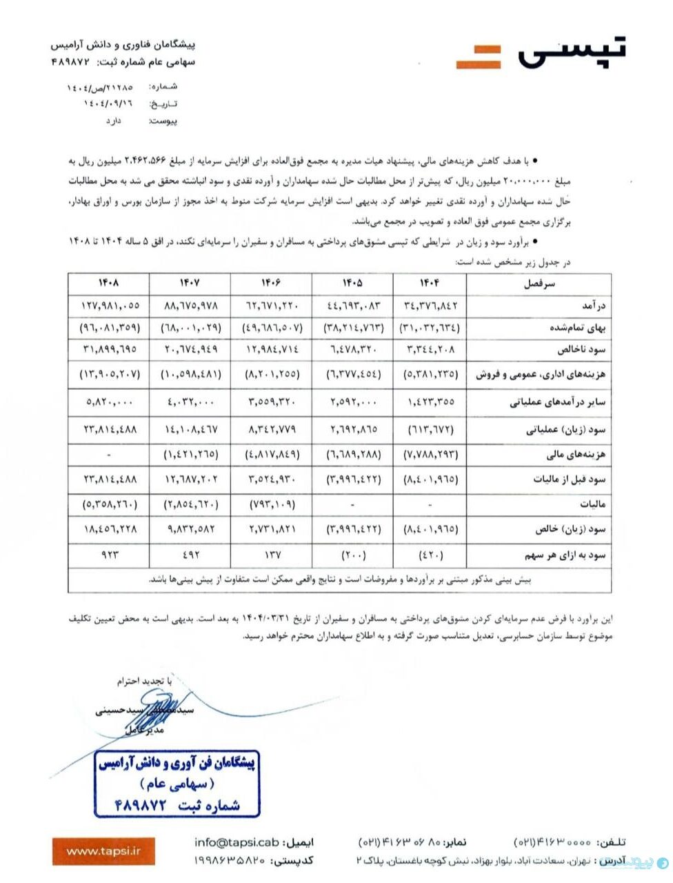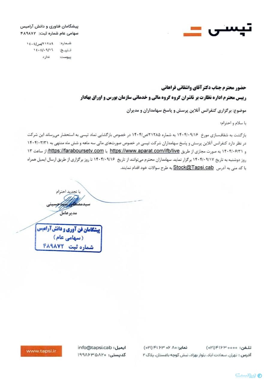 تپسی در اطلاعیهای اعلام کرد درخصوص بازگشایی نماد معاملاتی این شرکت، کنفرانس آنلاین پرسش و پاسخ سهامداران درباره صورتهای مالی سه ماهه و ۶ ماهه منتهی به ۳۰ خرداد ۱۴۰۴ به تاریخ ۱۷ آذرماه از ساعت ۱۳ بهصورت آنلاین برگزار خواهد شد.