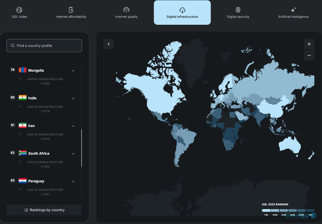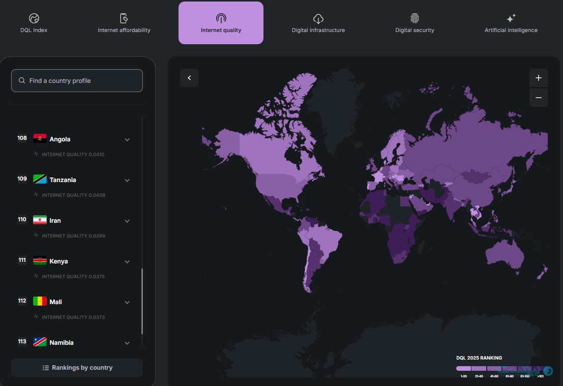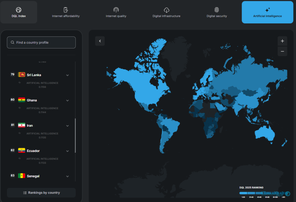 در نگاه کلی نیز شاخص کیفیت زندگی دیجیتال ایران را در جایگاه صدم جهان و پایینتر از نپال قرار میدهد و کشورهای فنلاند، آلمان، دانمارک، سوئیس و فرانسه (به ترتیب) بهترین جایگاه را دارند.