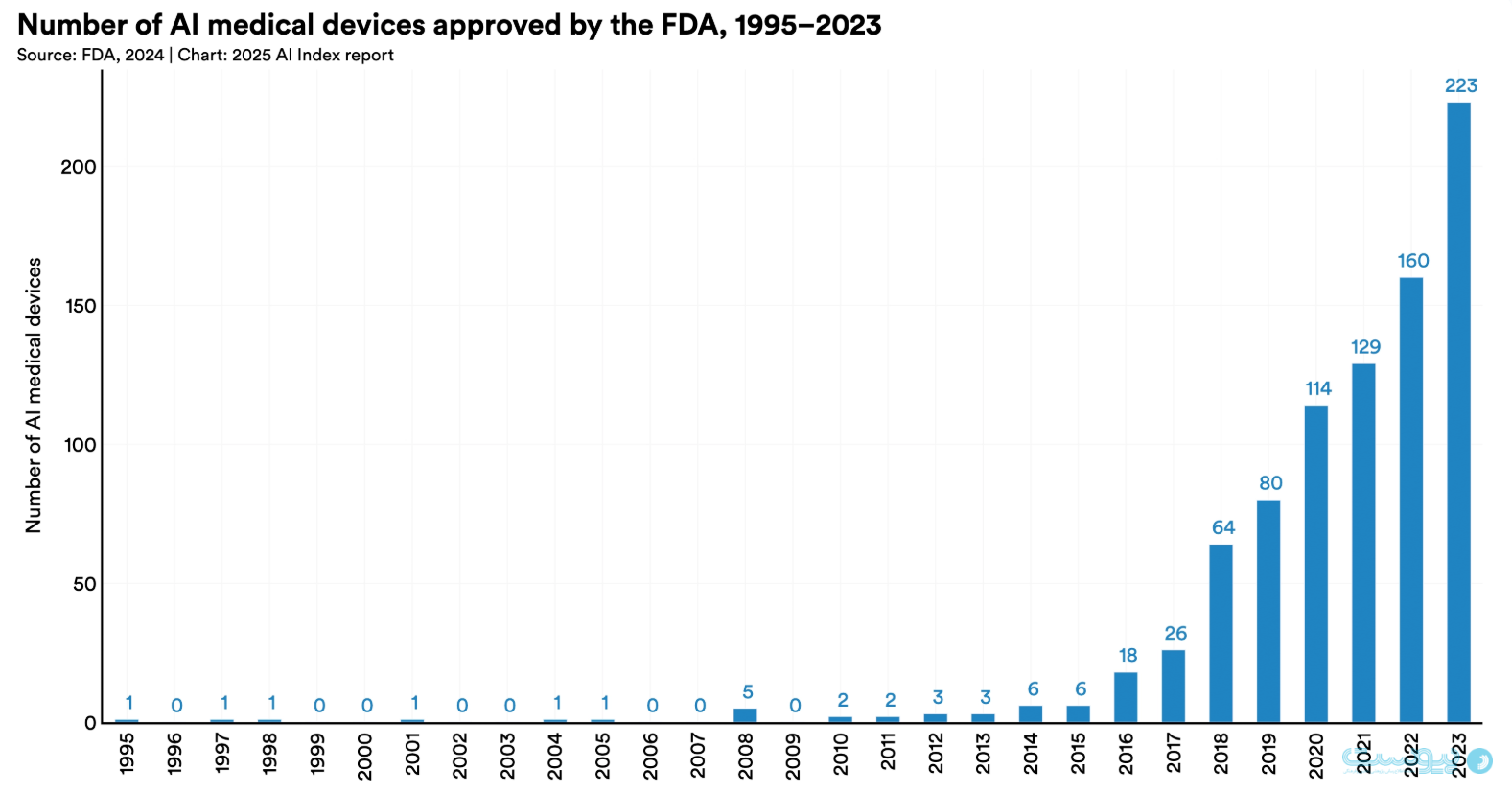 از حوزه بهداشت و درمان گرفته تا حملونقل، هوش مصنوعی بهسرعت از آزمایشگاهها وارد زندگی روزمره میشود. در سال ۲۰۲۳، FDA تعداد ۲۲۳ دستگاه پزشکی مجهز به هوش مصنوعی را تأیید کرد، در حالی که این عدد در سال ۲۰۱۵ تنها ۶ دستگاه بود. در جادهها، خودروهای خودران دیگر آزمایشی نیستند: شرکت Waymo، یکی از بزرگترین ارائهدهندگان خدمات خودران در آمریکا، بیش از ۱۵۰ هزار سفر خودکار در هفته ارائه میدهد، و ناوگان Apollo Go شرکت Baidu اکنون در چندین شهر چین فعالیت میکند و خدمات روبات تاکسی مقرونبهصرفه ارائه میدهد.